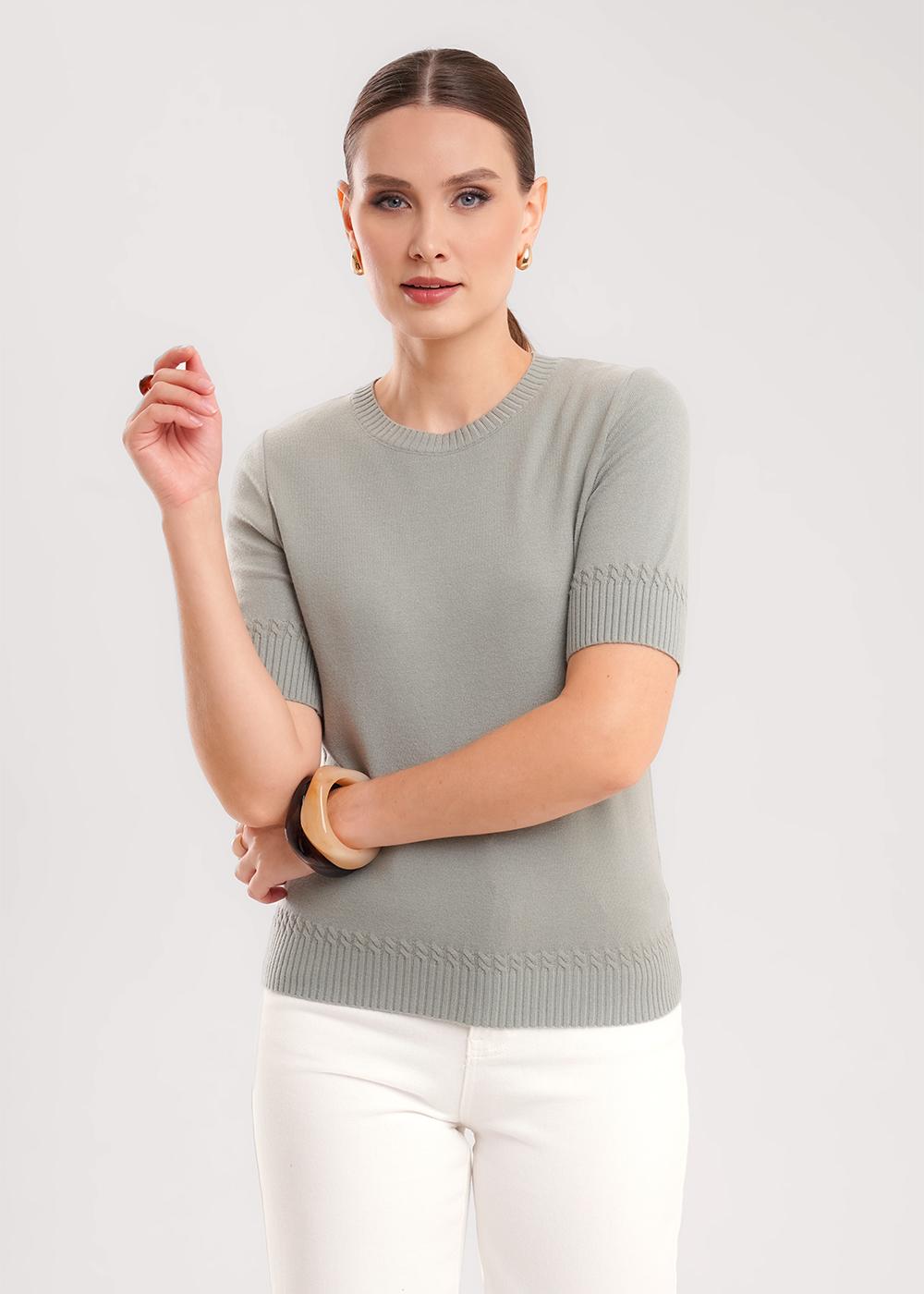 Вязаный джемпер укороченный из вискозной пряжи с добавлением нейлона, переплетения гладь. Втачной короткий рукав. Округлая горловина, по горловине бейка. По низу изделия и рукавов манжеты,в качестве декоративного элемента над манжетами вывязаны косы.