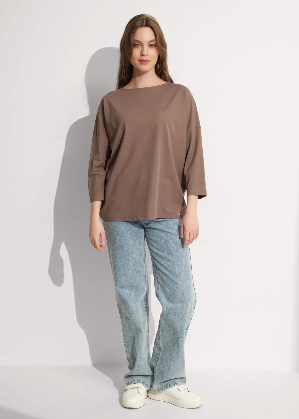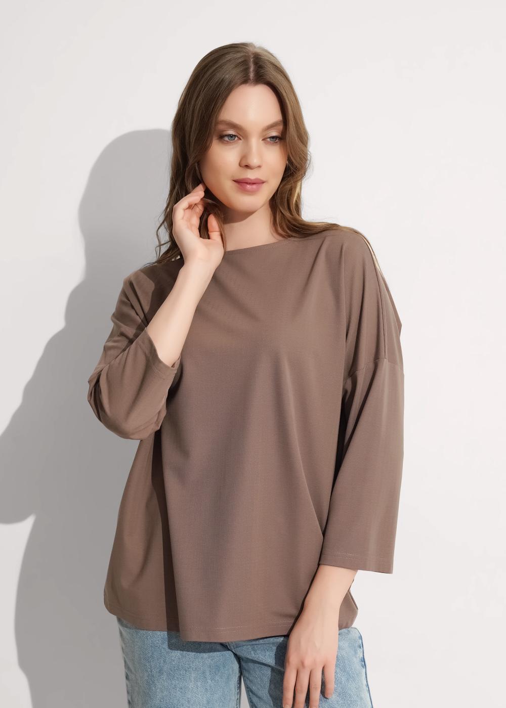 Джемпер прямого свободного кроя из трикотажного полотна интерлок. Спущенная линия плеча, длинный рукав. Округлая горловина с внутренней окантовкой. Спереди металлическая нашивка.