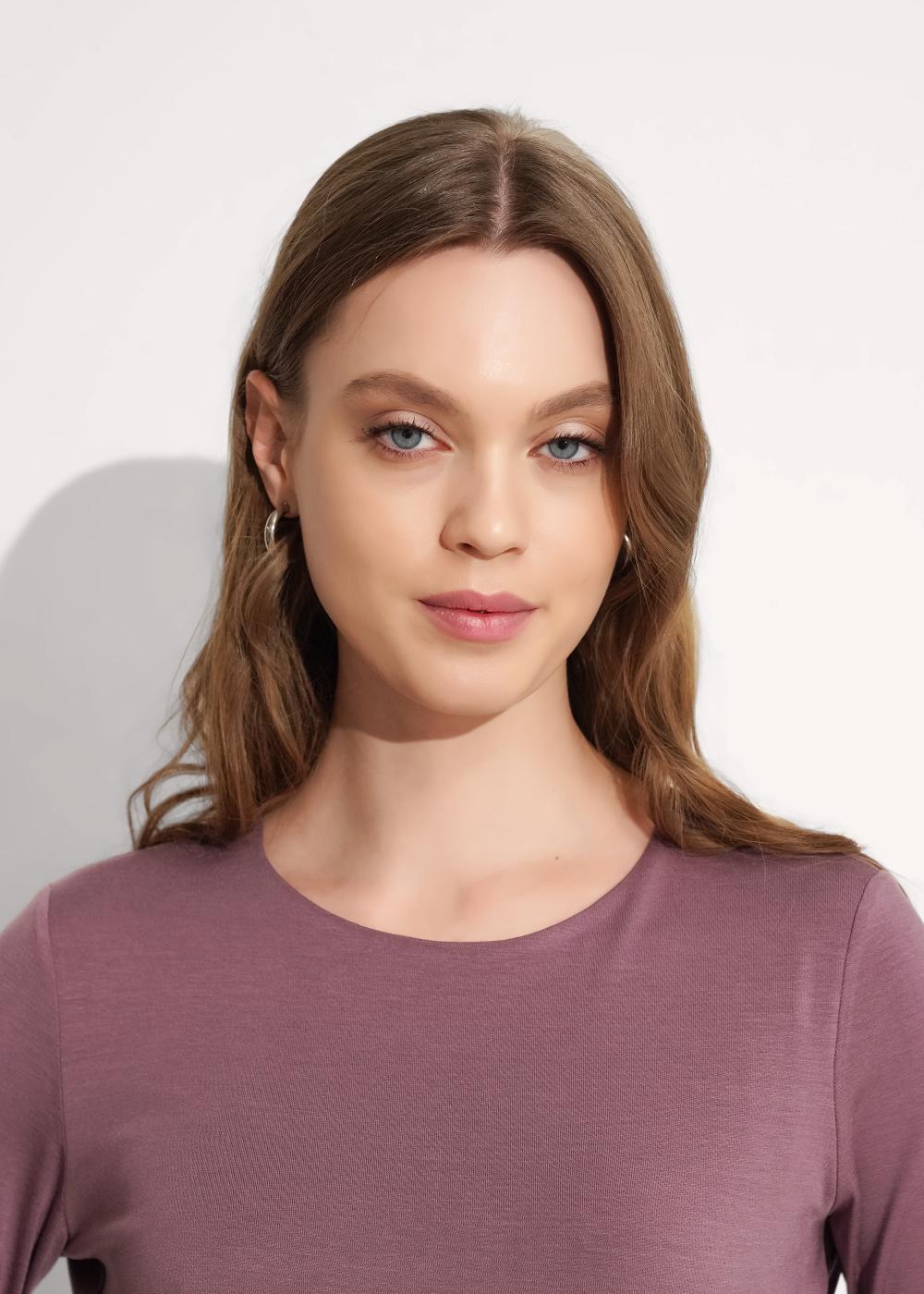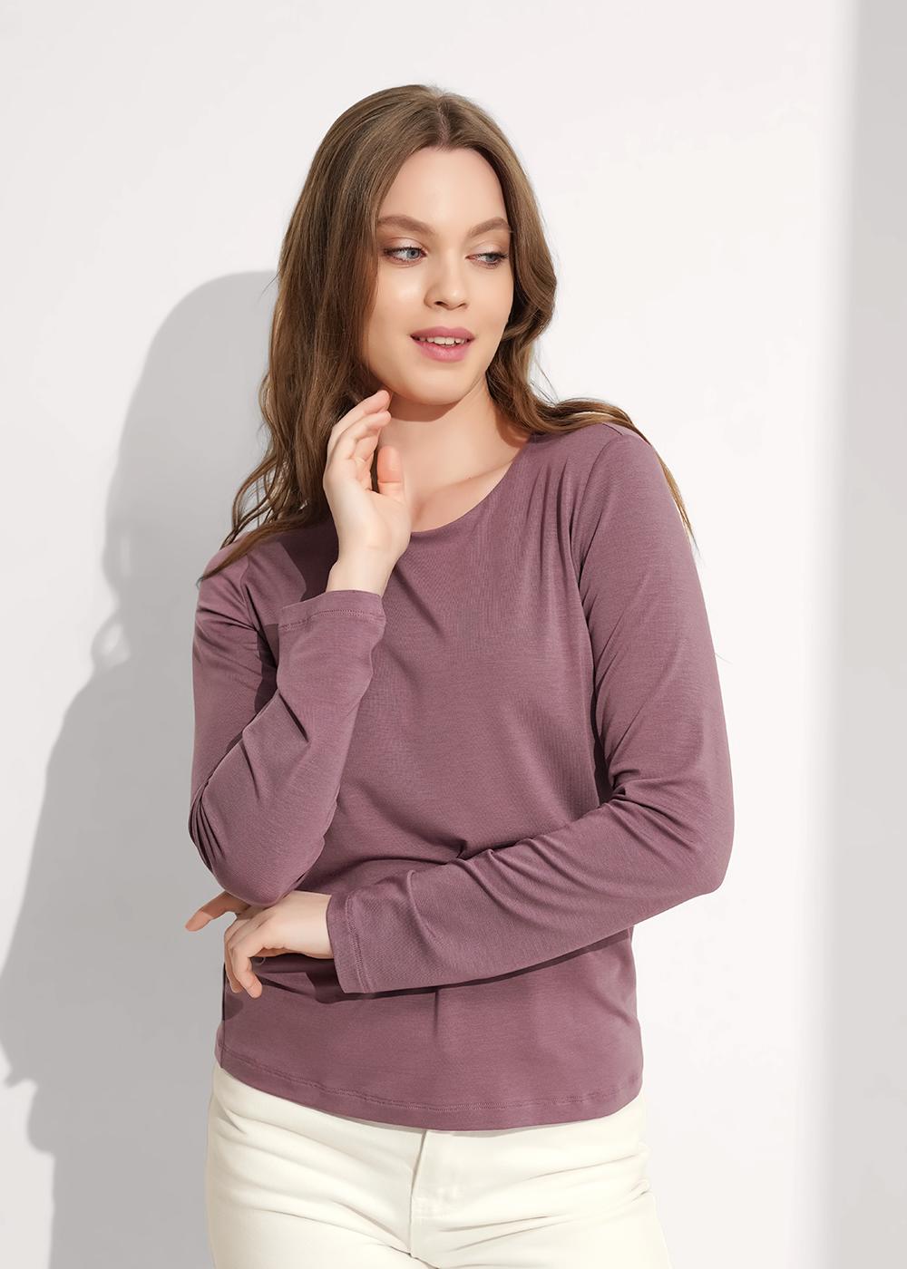 Фуфайка прямого силуэта из трикотажного полотна тенсель с эластаном. Втачной длинный рукав. Двойной перед до линии лифа. Округлая горловина с внутренней окантовкой по спинке.