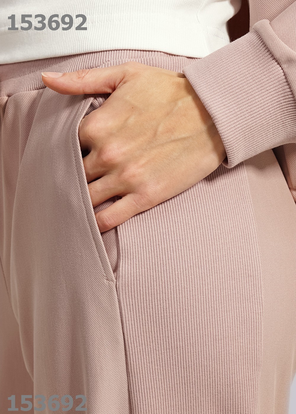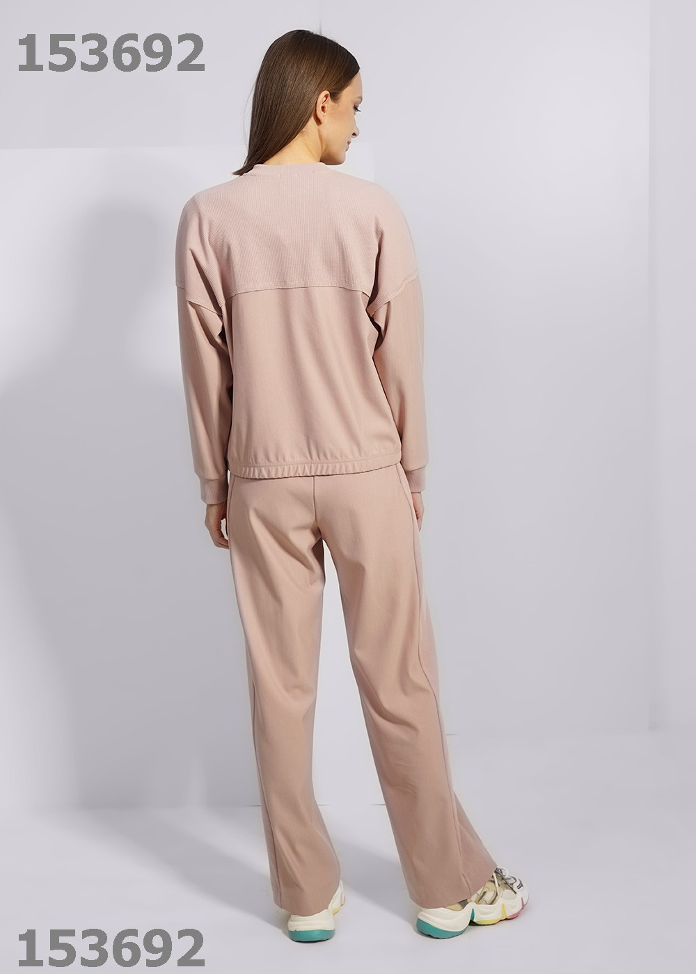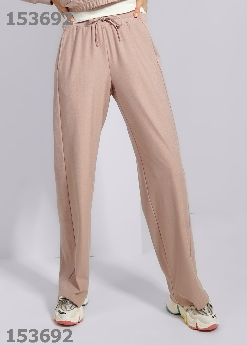 Брюки прямого кроя из тонкого эластичного футера 2х нитки. Отрезной пояс из кашкорсе на внутренней резинке с отстрочкой и шнуром из окантовки. По бокам карманы в швах и лампасы из кашкорсе.