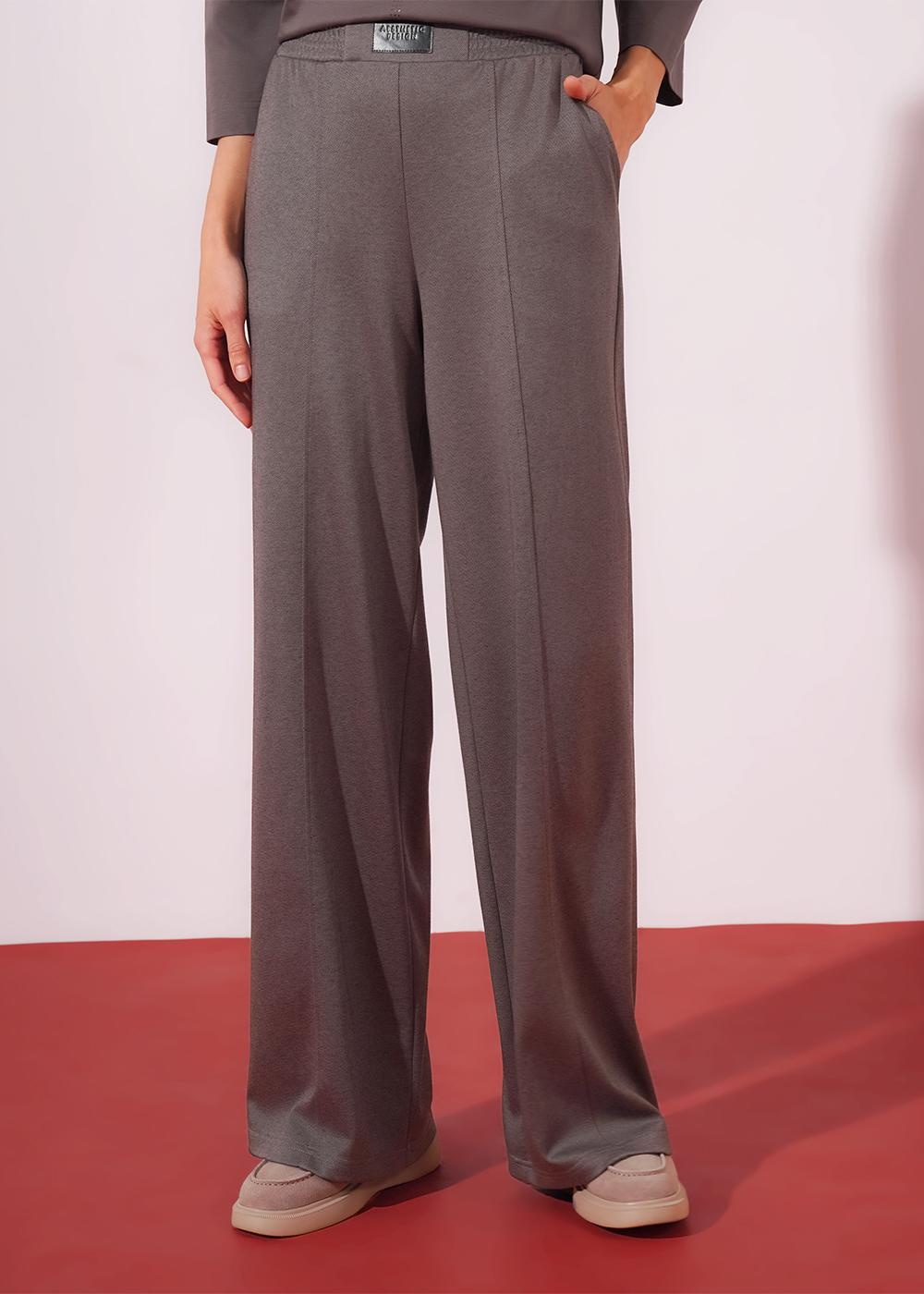 "Описание: Брюки из трикотажного полотна джинс-трикотаж, широкие. По талии притачной пояс на внутренней резинке, спереди нашивка. По переду застроченные резы. Боковые карманы с отрезным бочком.
