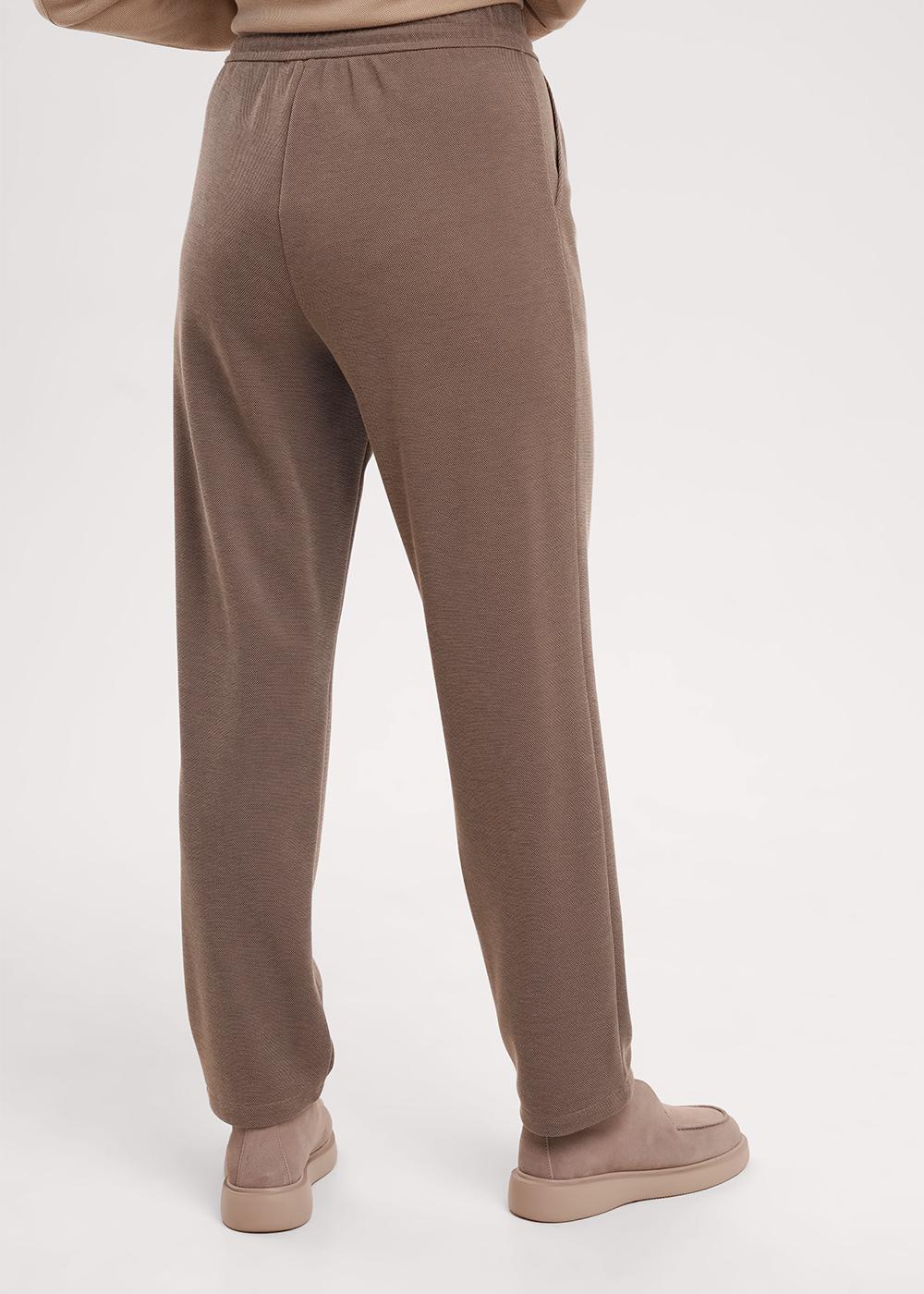 Описание: Брюки зауженные из трикотажного полотна пике жаккард. По талии притачной пояс на внутренней резинке со шнуром из окантовки, спереди нашивка. Боковые карманы с отрезным бочком. По переду застроченные стрелки.