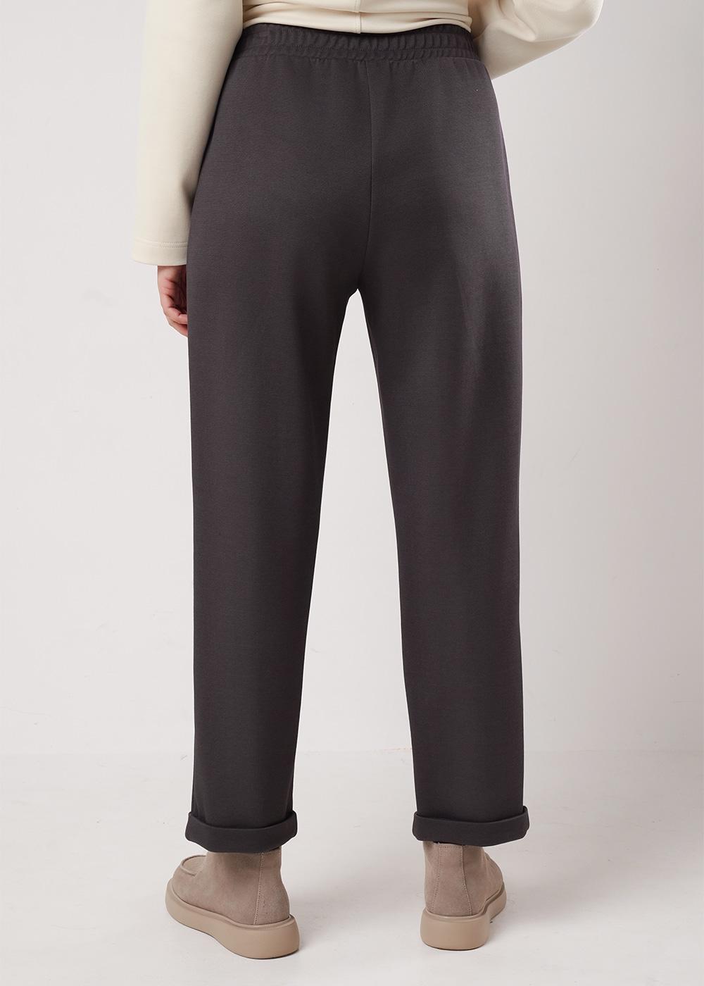 Описание: Брюки зауженные из трикотажного полотна плотное пике, умеренного объёма. Боковые карманы с отрезным бочком. Притачной пояс на внутренней резинке. По низу брюк отвороты.
