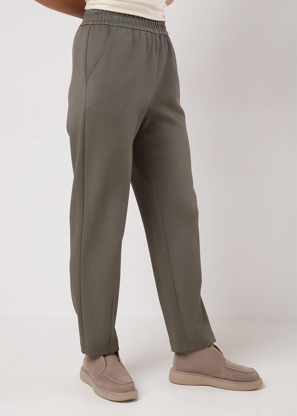 "Описание: Брюки зауженные из трикотажного полотна плотное пике. По талии притачной пояс на внутренней резинке. Боковые карманы с отрезным бочком. По низу переда брюк вытачки.