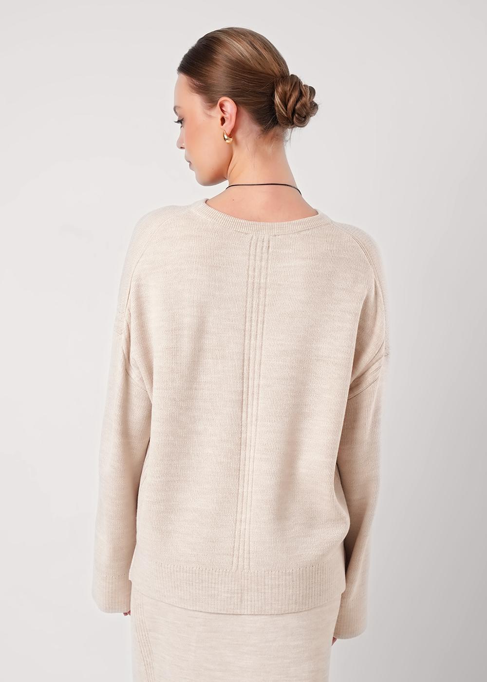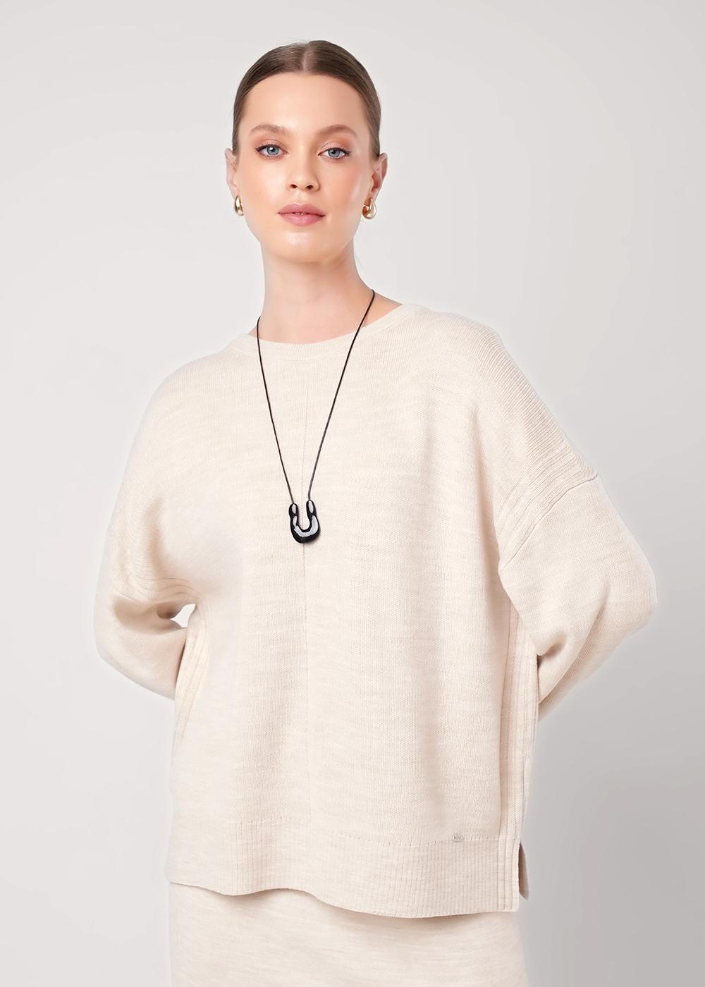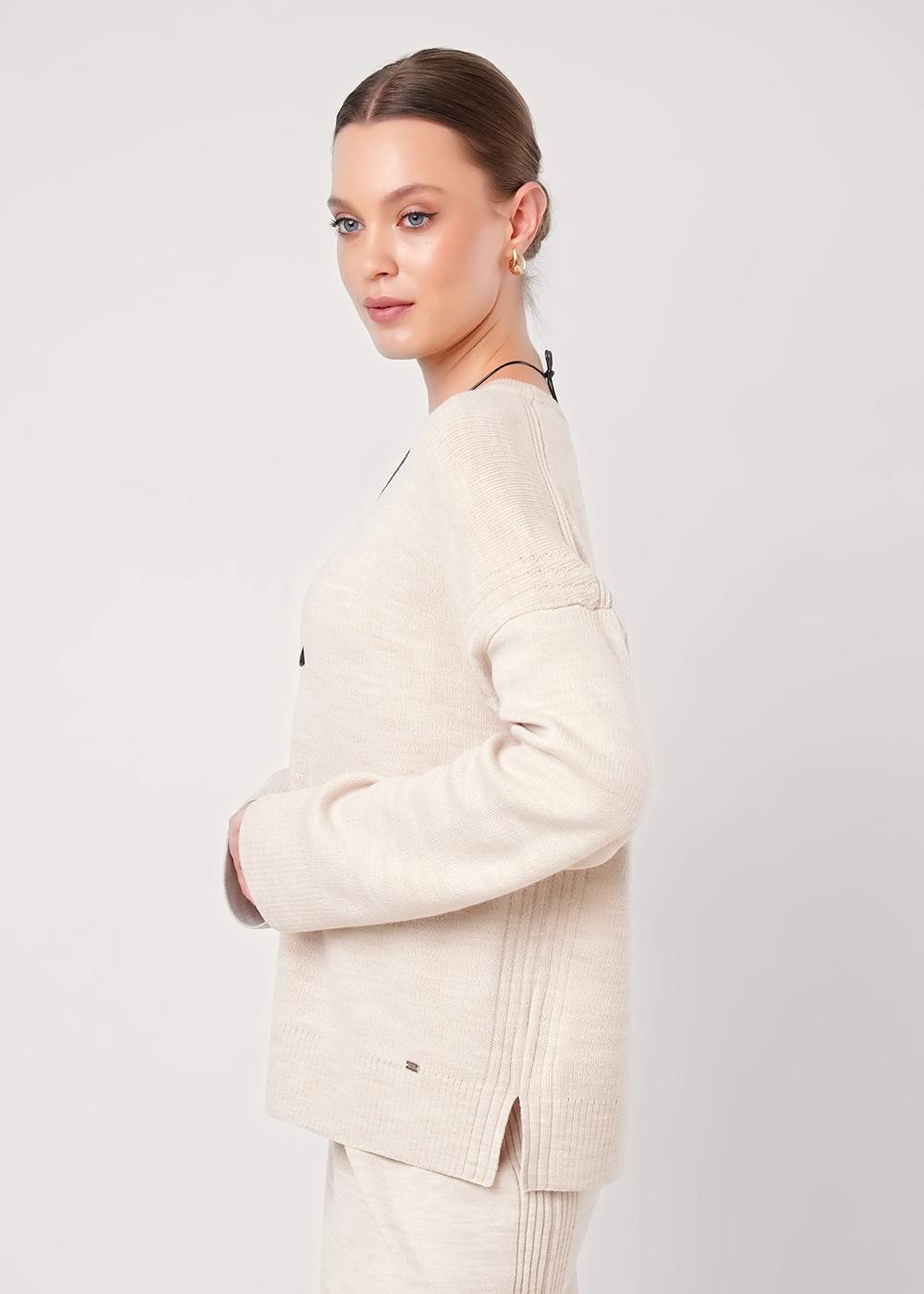 Описание: Вязаный джемпер из акриловой пряжи, переплетение гладь,свободного силуэта.Округлая горловина с бейкой. Длинный рукав со спущенной линией плеча.Вертикальные полосы сбоку и пройме. По низу изделия и рукавов широкие манжеты. Боковые разрезы, нашивка металл.