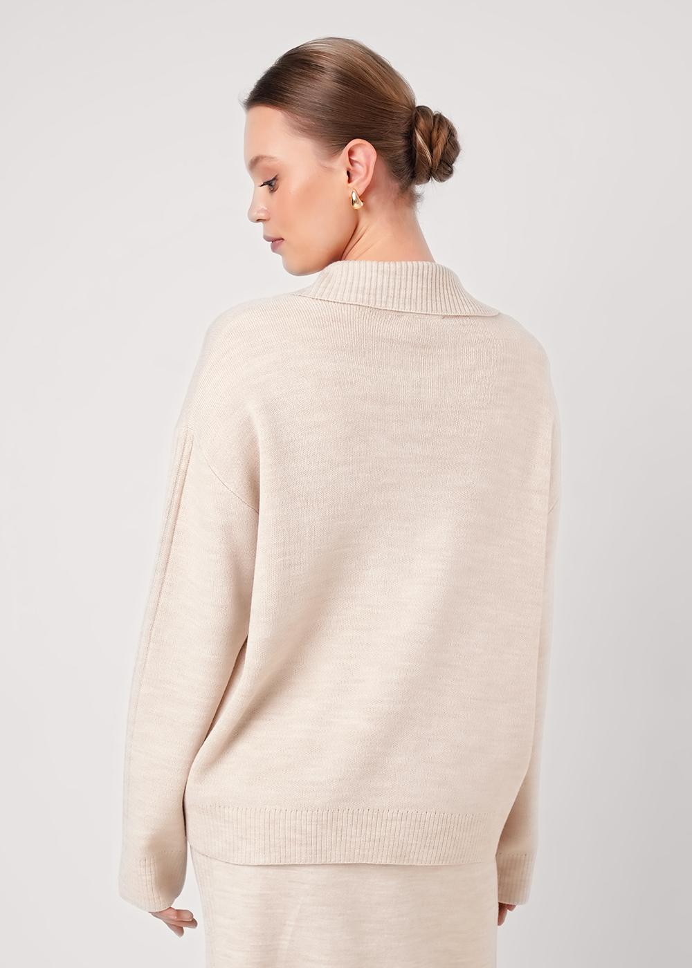 Описание: Вязаный джемпер из акриловой пряжи, переплетение гладь свободного силуэта. По горловине отложной воротник с планкой. Длинный рукав со спущенной линией плеча,вертикальные полосы. По низу изделия и рукавов манжеты. Нашивка металл.