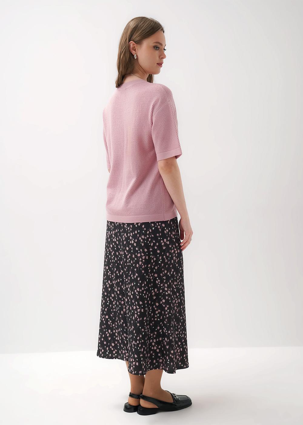 Описание: Вязаный джемпер прямого силуэта из вискозной пряжи с добавлением нейлона, ажурного переплетения. Короткий втачной рукав. Округлая горловина с бейкой. По низу изделия и рукава сдвоенная гладь.