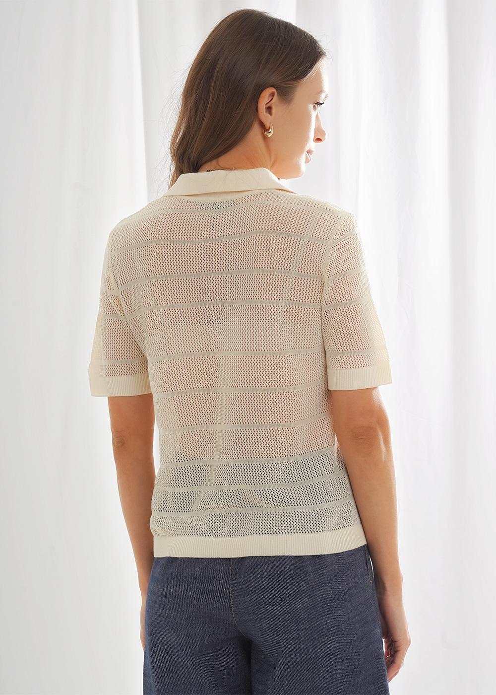 Описание: Вязаный джемпер прямого кроя из хлопковой пряжи с добавлением акрила, ажурного переплетения. Горловина с планкой и отложным воротником. Короткий втачной рукав. По низу изделия и рукавов узкие манжеты ластичного переплетения.