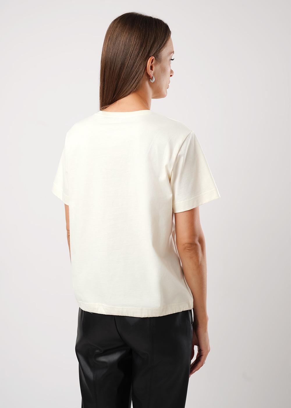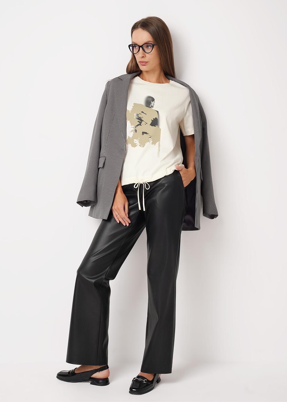 Описание: Джемпер из хлопкового трикотажного полотна. Округлая горловина с обтачкой из рибаны, короткий втачной рукав. По низу кулиса. По переду принт фольга.