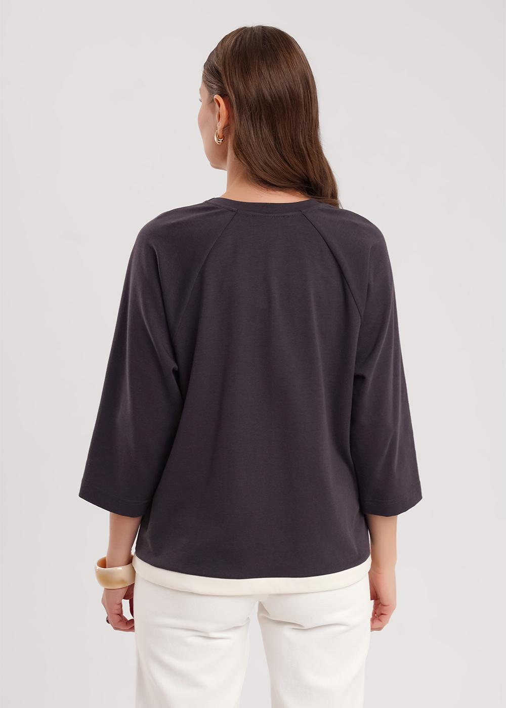 Описание: Джемпер свободного кроя из эластичного хлопкового полотна. Рукав реглан длиной 7/8. Округлая горловина с обтачкой. По низу изделия притачная контрастная кулиса с внутренним шляпным шнуром и стопором. Спереди принт.