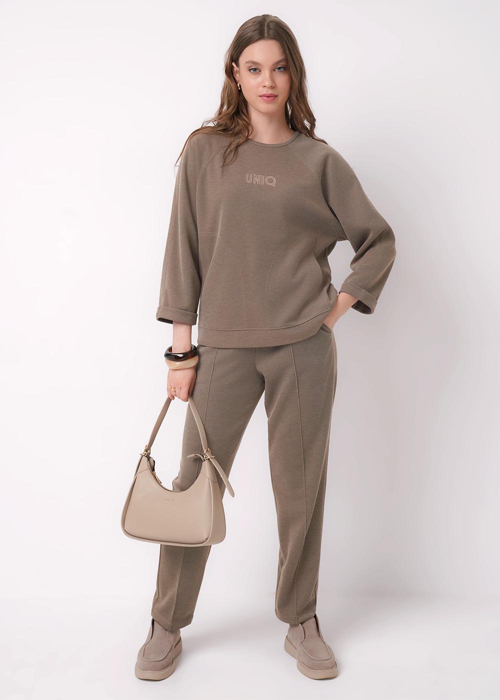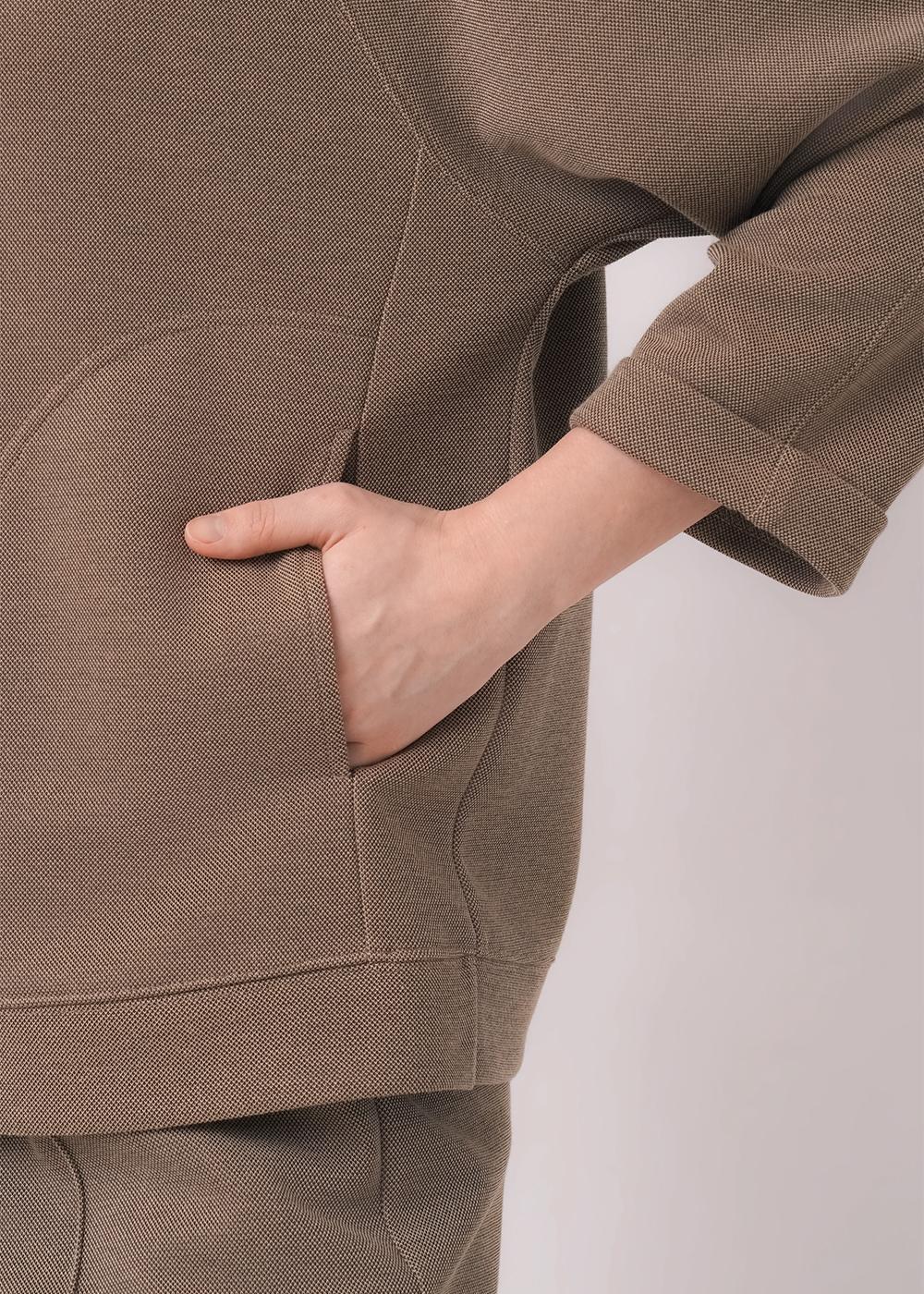 Описание: Джемпер свободного кроя из трикотажного полотна пике жаккард. Длинный рукав реглан,по низу отложной манжет. Округлая горловина с обтачкой. По переду рельефы с карманами в шве. По низу изделия притачной пояс. Спереди вышивка.