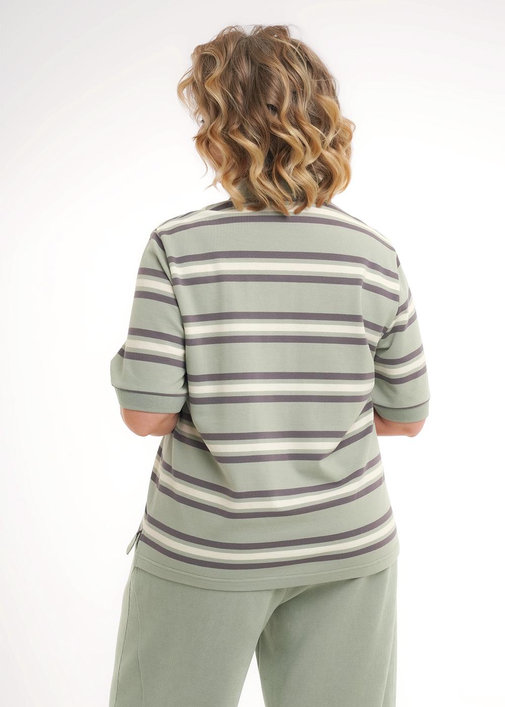 Описание: Джемпер-поло прямого кроя из трикотажного полотна пике. Короткий втачной рукав, по низу рукава вязаный манжет. По горловине отложной вязаный воротник с цельнокроенной планкой на пуговицы. По бокам разрезы. Спереди нашивка.