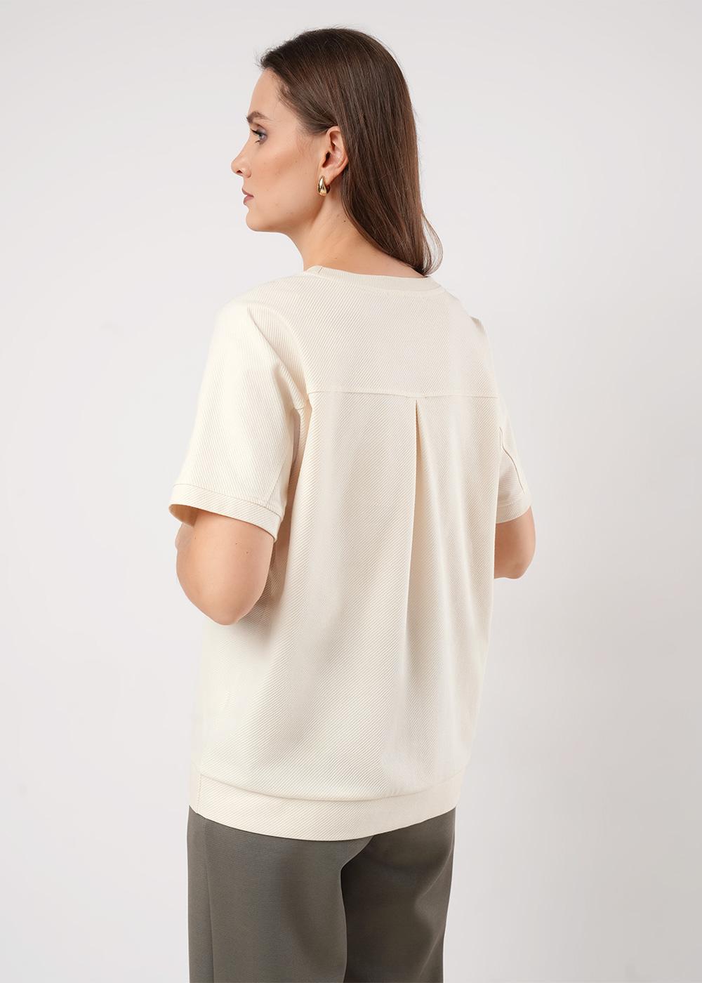 Описание: Джемпер свободного объема из трикотажного полотна. Округлая горловина с обтачкой из кашкорсе. Короткий цельнокроеный рукав, по низу манжет. По спинке кокетка со складкой. По низу изделия манжет. Спереди принт с вышивкой.