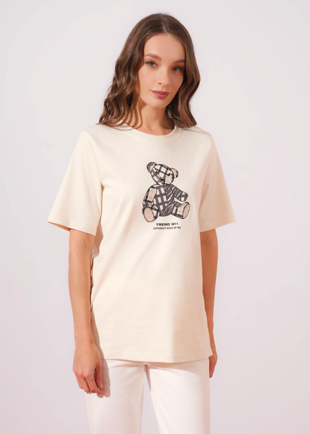 "Описание: Футболка из хлопкового трикотажного полотна. Округлая горловина с обтачкой из кашкорсе. Короткий рукав со спущенной линией плеча. По бокам разрезы. Спереди принт.