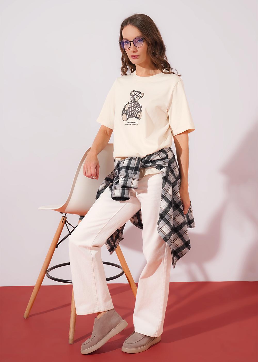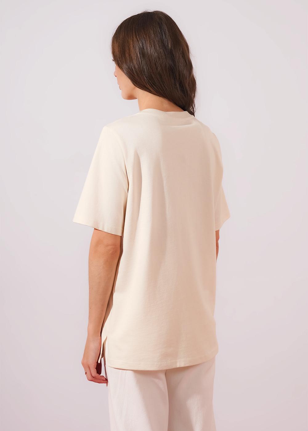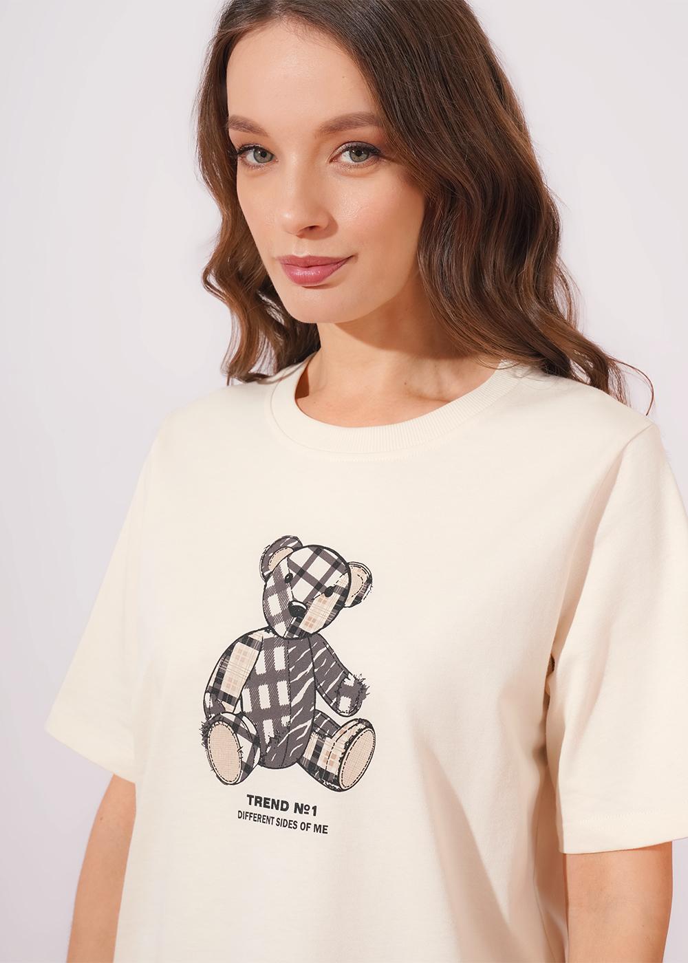 Описание: Футболка из хлопкового трикотажного полотна. Округлая горловина с обтачкой из кашкорсе. Короткий рукав со спущенной линией плеча. По бокам разрезы. Спереди принт.