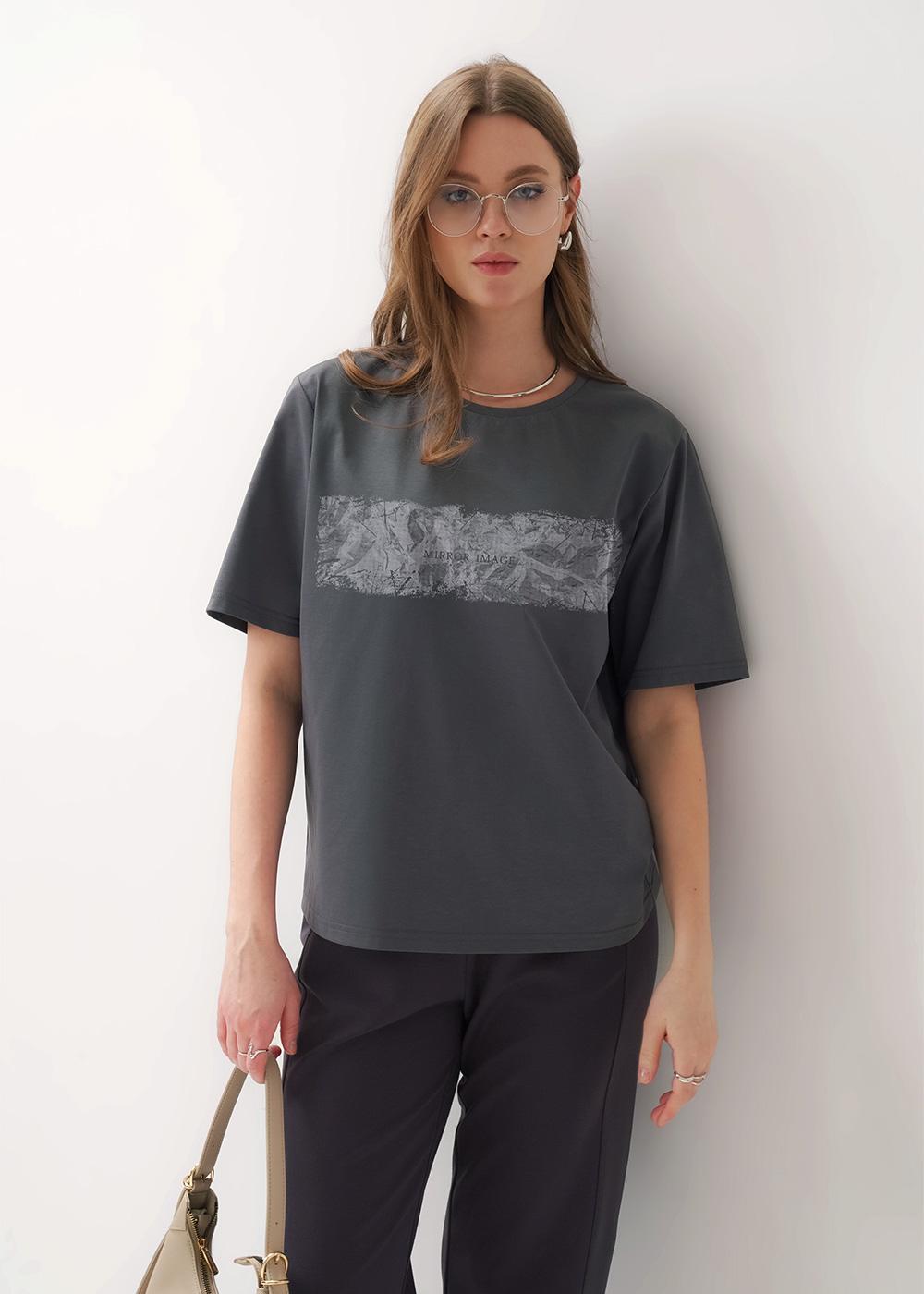 Описание: Футболка из трикотажного полотна прямого кроя. Короткий втачной рукав. Округлая горловина с обтачкой. Спереди принт с фольгой..