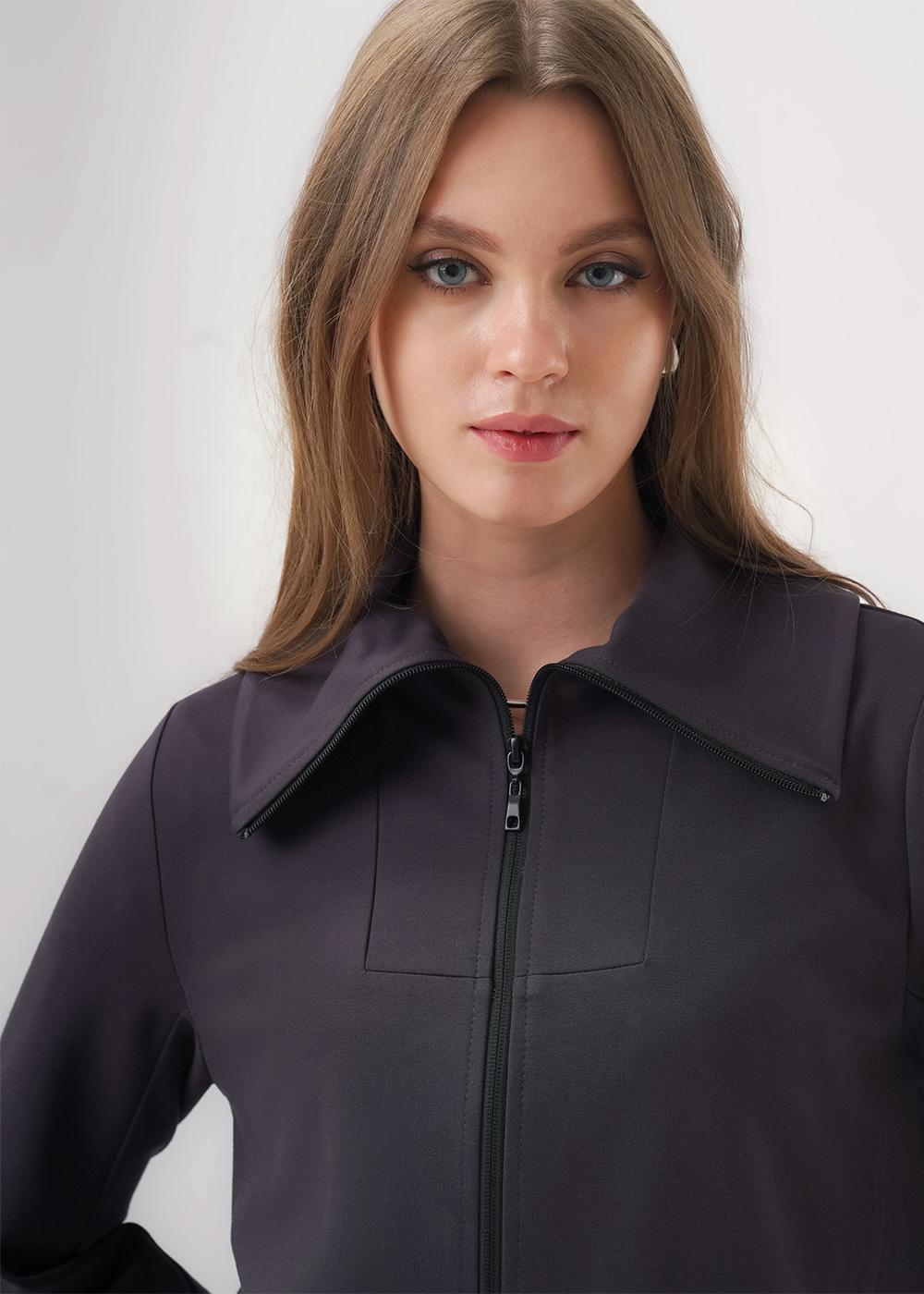 "Описание: Куртка из трикотажного полотна дабл фейс, на молнии. Длинный втачной рукав. По горловине отложной воротник. По переду и спинке резы. Спереди нашивка.