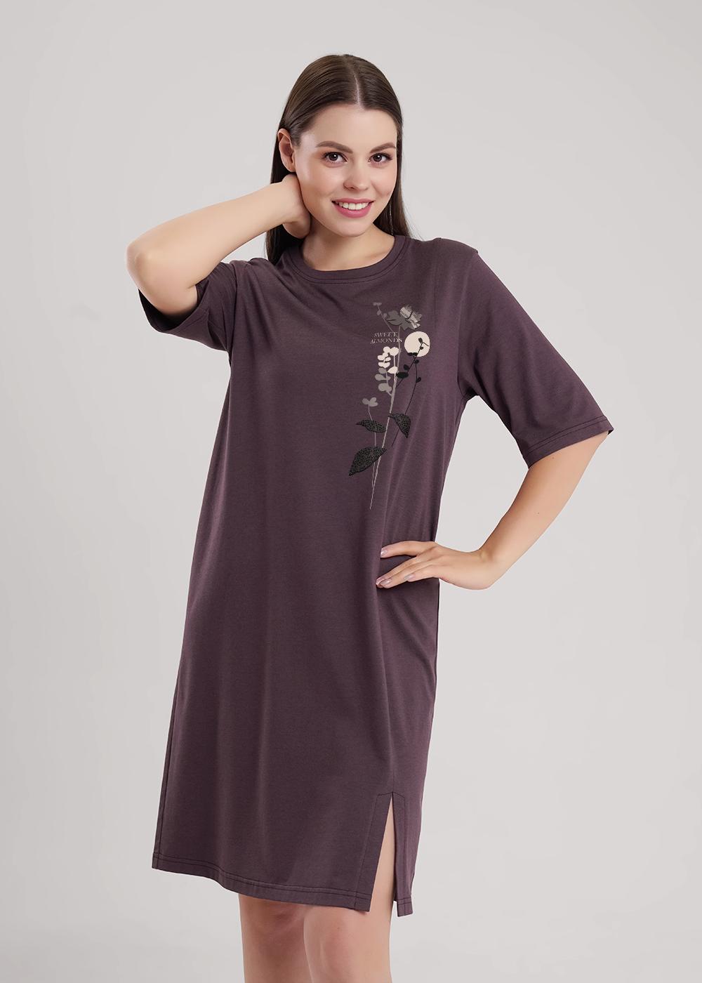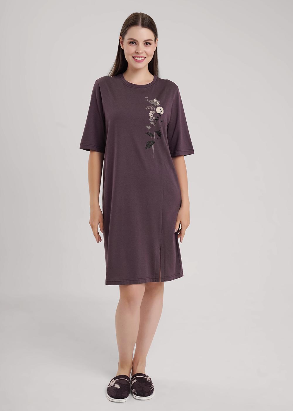 Описание: Платье для дома и отдыха из трикотажного полотна с добавлением модала, прямого силуэта. Округлая горловина с обтачкой. Втачной короткий рукав. По переду вертикальный рез, внизу с разрезом. Спереди и по рукаву принт.