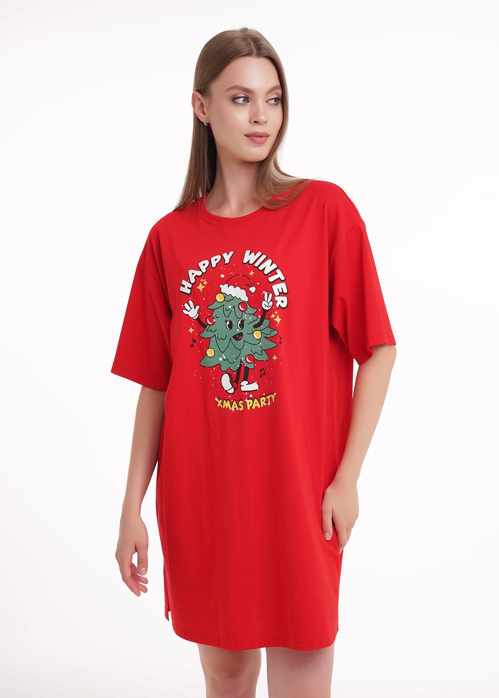 Описание: Платье для дома и отдыха из хлопкового трикотажного полотна прямого кроя, длиной до колена. Короткий втачной рукав. Округлая горловина с обтачкой. Спереди принт.