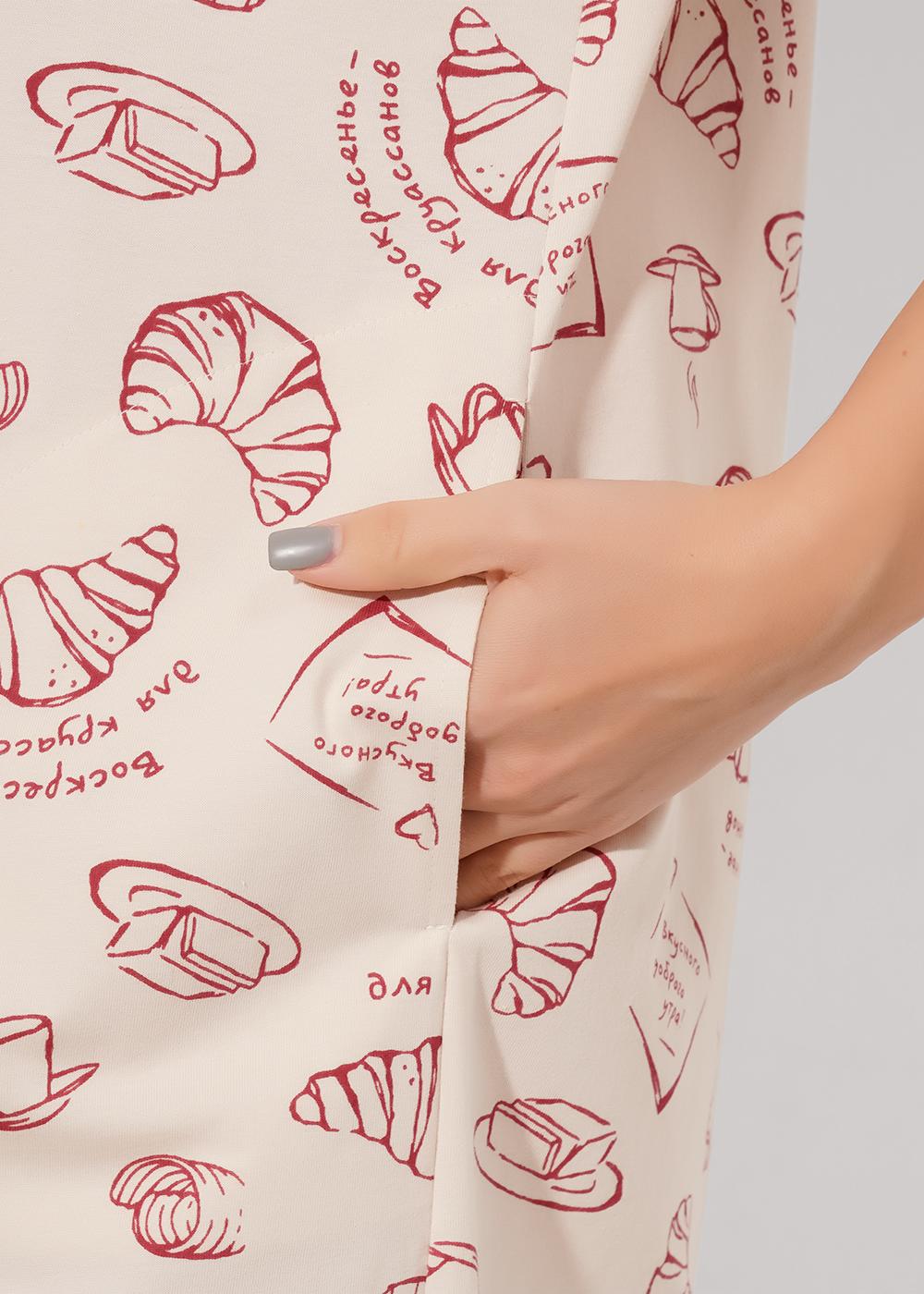 Описание: Платье для дома и отдыха прямого силуэта из хлопкового трикотажного полотна. Округлая горловина с обтачкой. Втачной короткий рукав. Спереди принт. Боковые карманы в швах. По бокам разрезы.