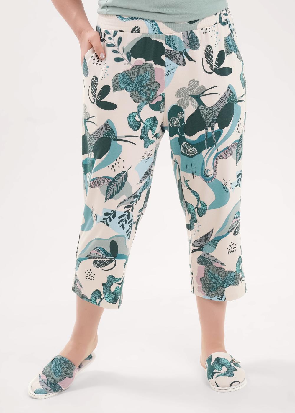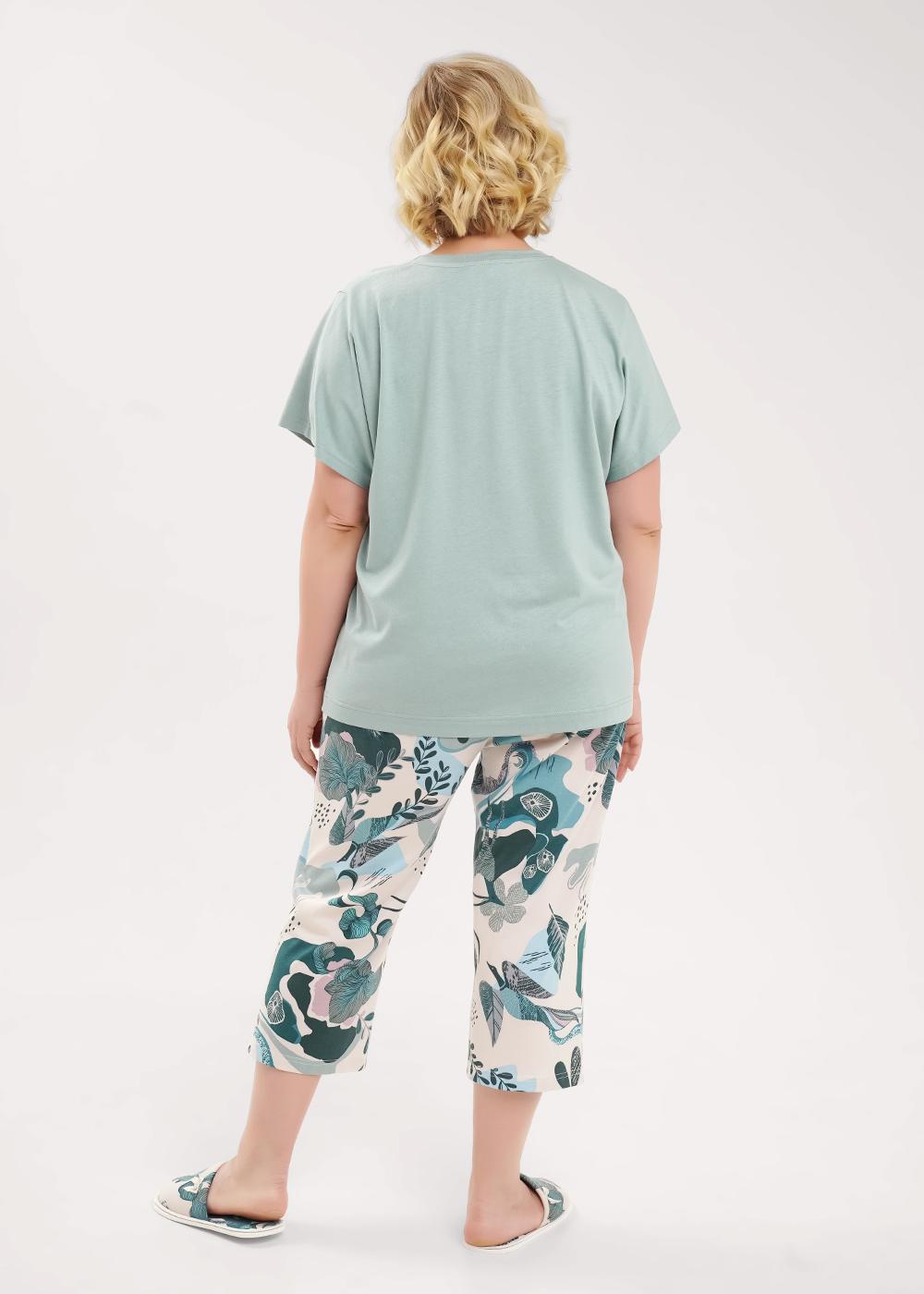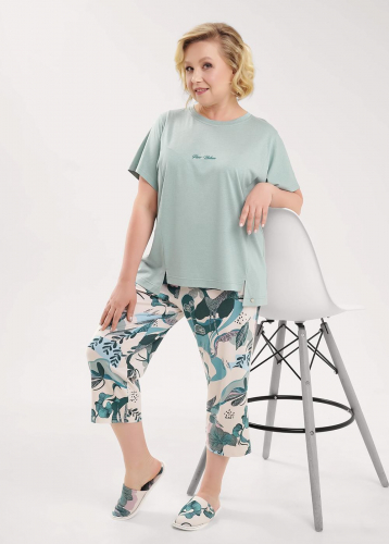 Описание: Набор одежды из трикотажного полотна с добавление модала.Футболка прямого кроя, цельнокроенный рукав.Округлая горловина с обтачкой. По переду вертикальные резы с разрезом, нашивка металл,спереди принт.Бриджы на резинке. Боковые карманы с отрезным бочком.