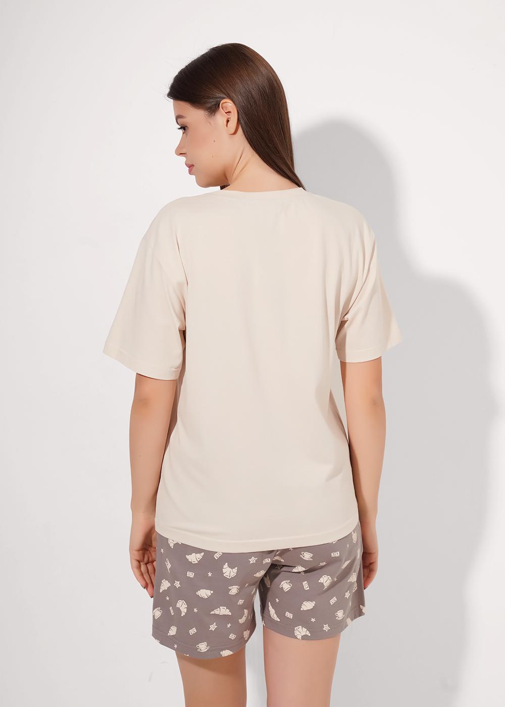 Описание: Набор одежды из хлопкового трикотажного полотна. Футболка прямого кроя. Короткий втачной рукав. Округлая горловина с обтачкой. Спереди принт. Шорты с поясом на внутренней резинке. Боковые карманы с отрезным бочком, спереди нашивка.
