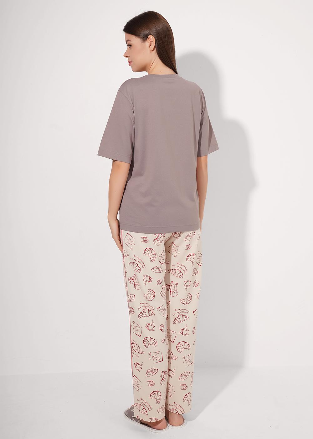 Описание: Набор одежды для дома и отдыха из хлопкового трикотажного полотна. Футболка прямого кроя. Короткий втачной рукав. Округлая горловина с обтачкой. Спереди принт. Брюки с поясом на внутренней резинке, по боковому шву -лампас из тесьмы, спереди нашивка.