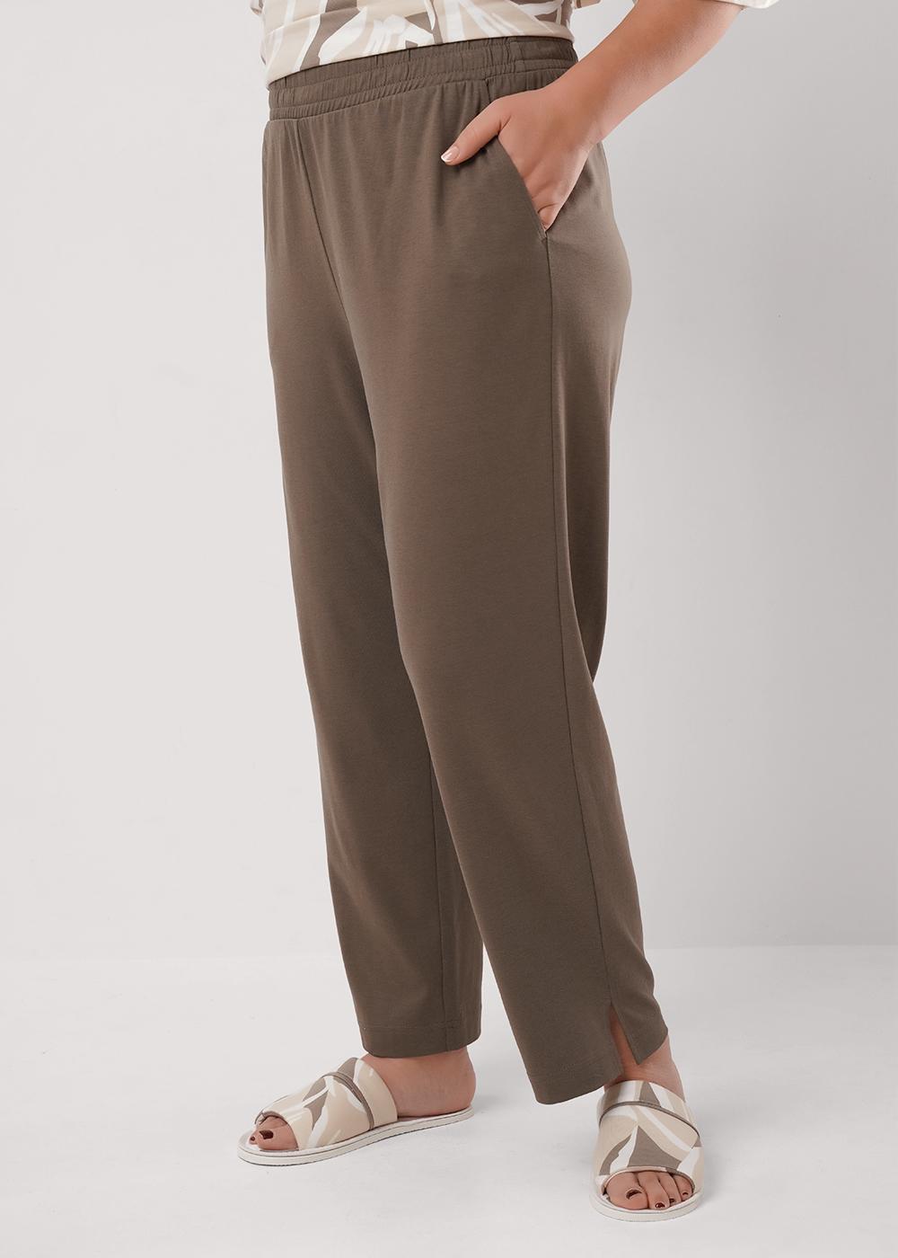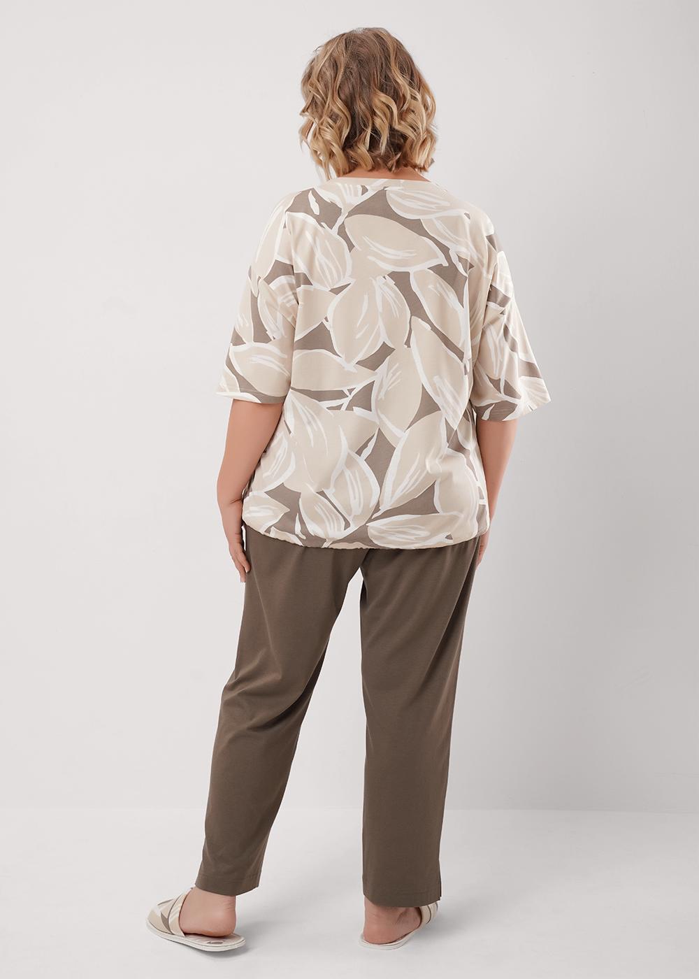 Описание: Набор одежды из трикотажного полотна с модалом.Джемпер с коротким цельнокроенным рукавом.Округлая горловина с обтачкой.Спереди рельефы,принт.По низу кулиса из окантовки.Брюки длиной 7/8,с поясом на резинке.Боковые карманы с отрезным бочком,внизу разрезы.