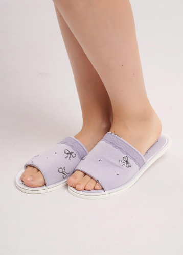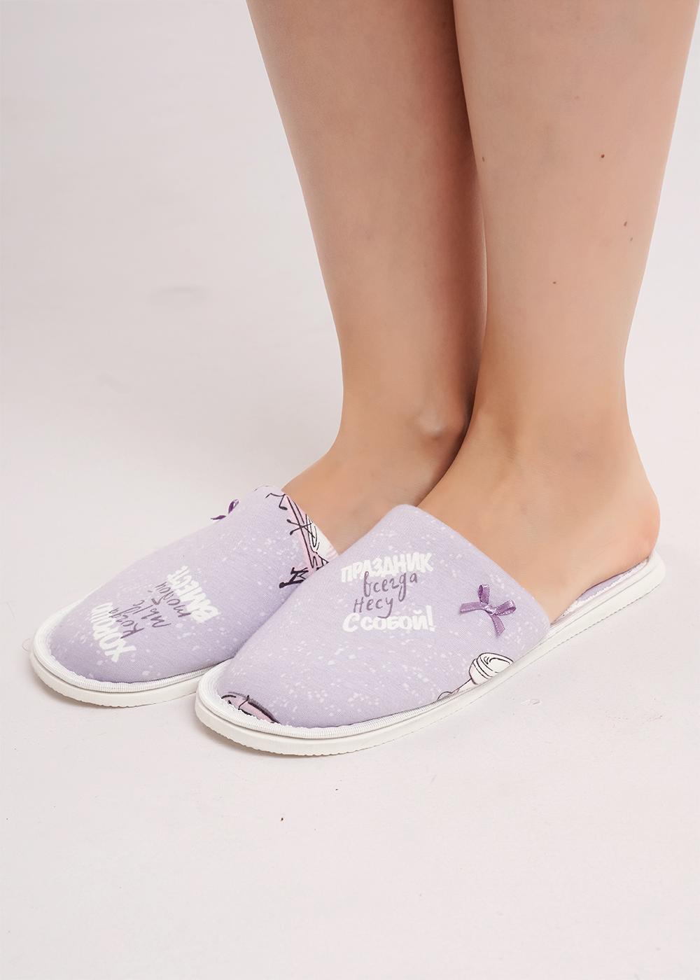 Описание: Лёгкие, домашние тапочки с закрытым носом из хлопкового трикотажного полотна . В верхней части тапок нашивка бант. Толстая подошва.
