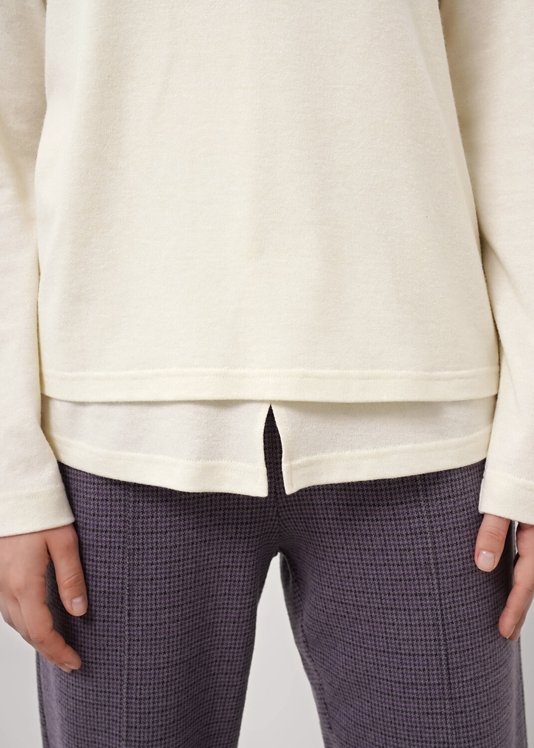 Джемпер из трикотажного полотна вискоза вязанная. Округлая горловина с окантовкой. Втачной длинный рукав. Перед двойной (нижний слой со средним швом и разрезом внизу).