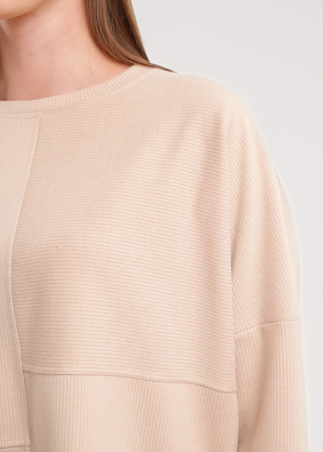 Джемпер свободного кроя из трикотажного поливискозного полотна джерси. Спущенный длинный рукав. Округлая горловина с обтачкой. Спереди резы с разным направлением полос. Боковые разрезы. По низу рукава и изделия потайной стежок.