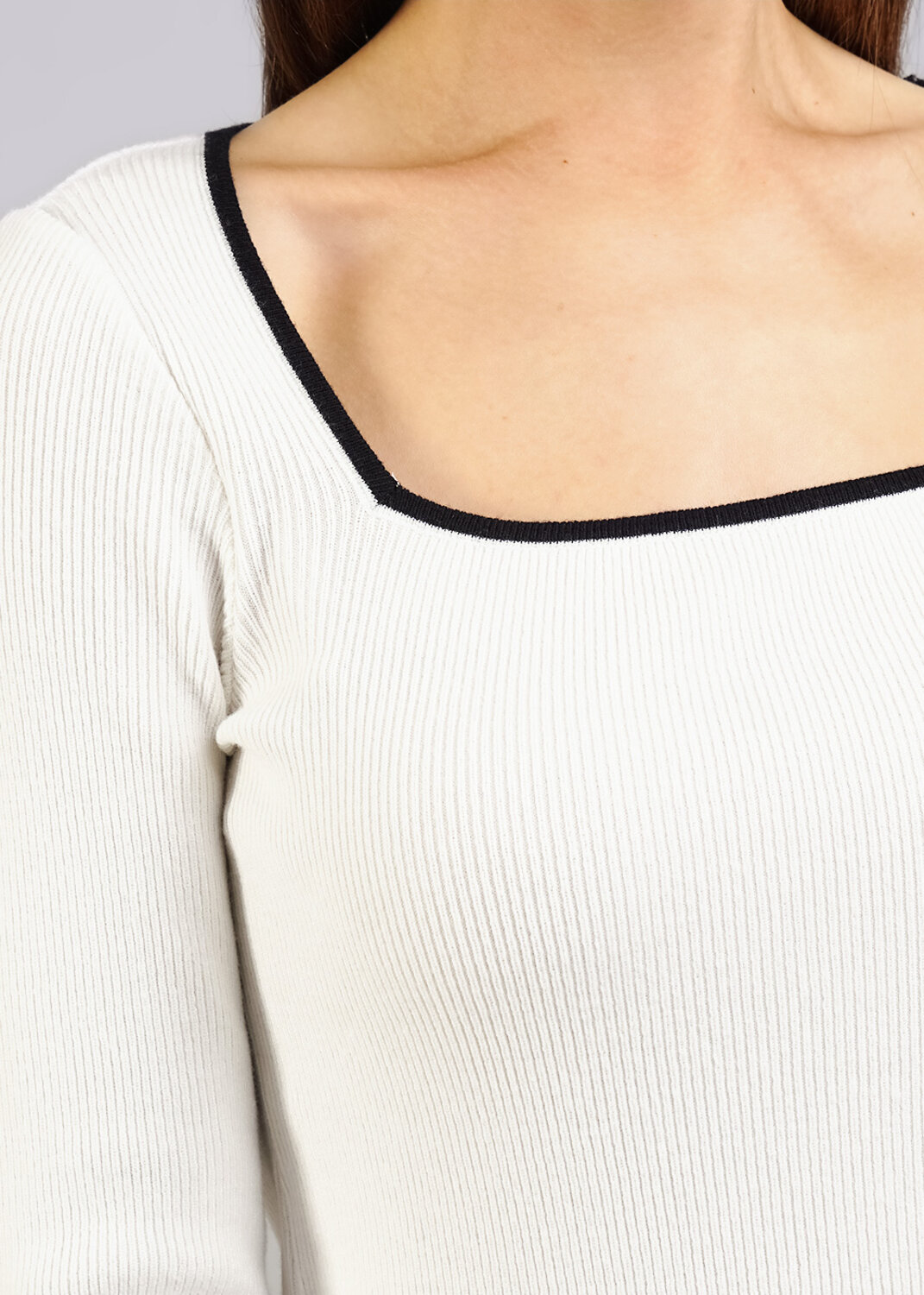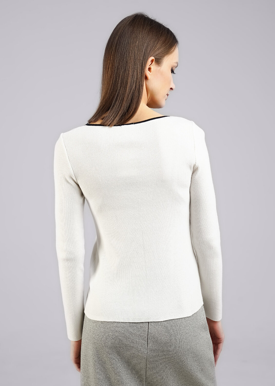 Вязаный джемпер из эластичной пряжи с вискозой в составе. Длинный втачной рукав. Квадратная форма горловины по краю декорирована контрастной черной отделкой.