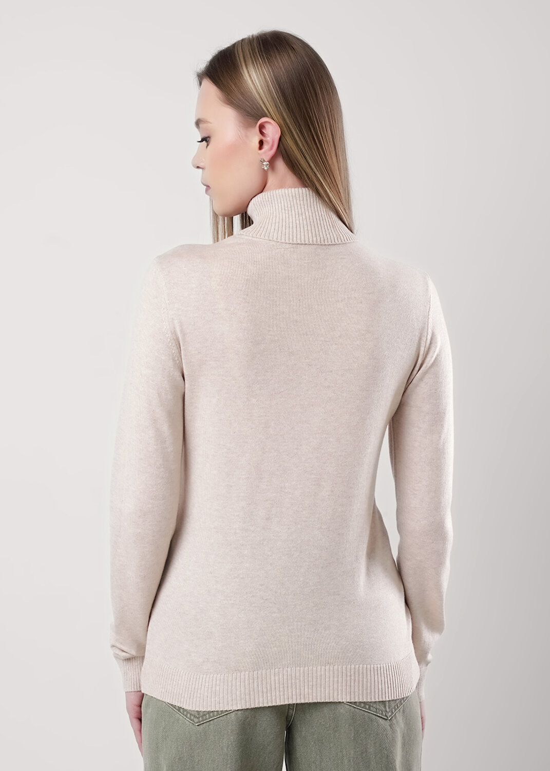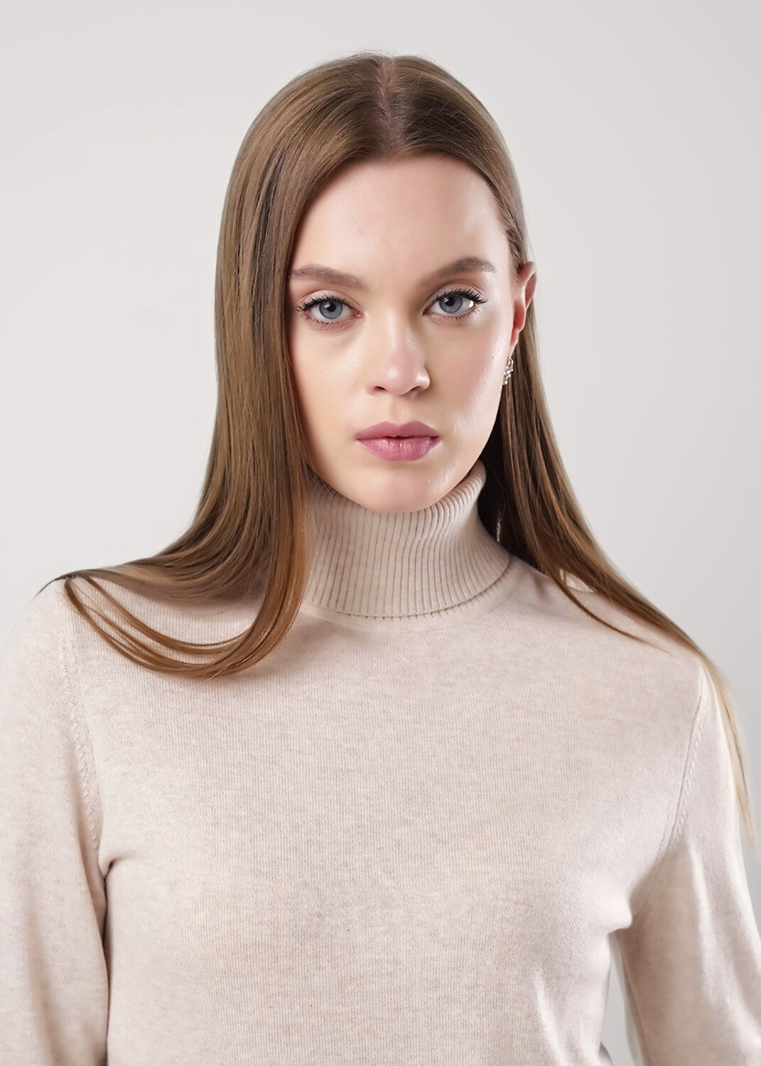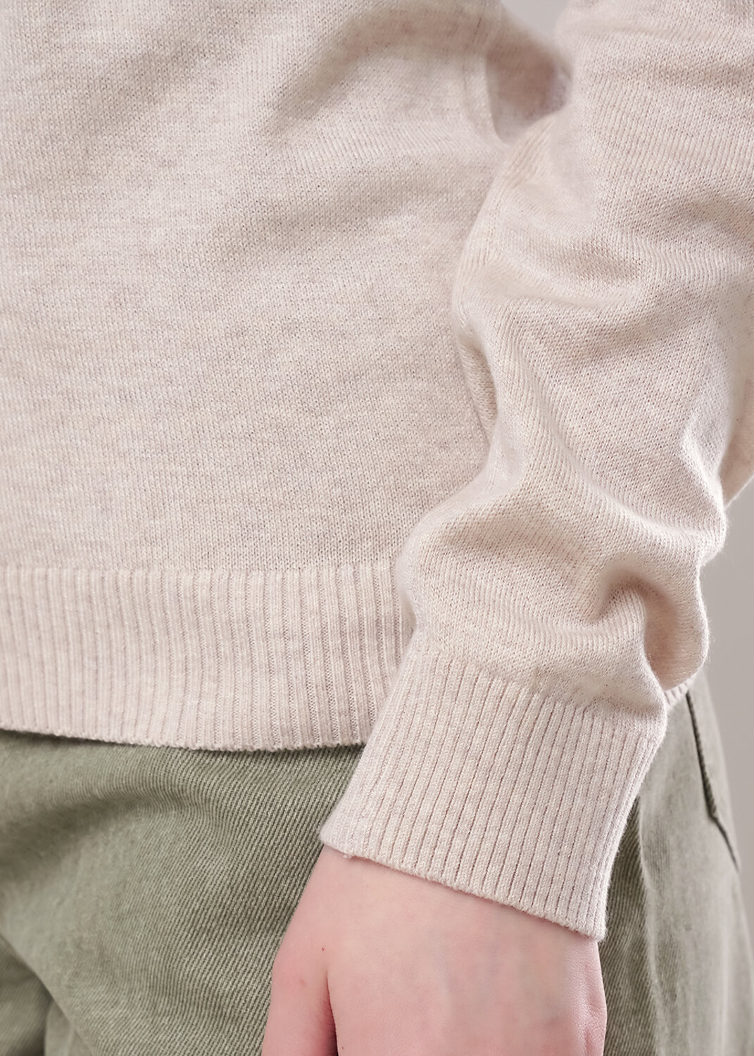 Базовый вязаный джемпер умеренного объема из акриловой пряжи с добавлением хлопка, переплетение гладь. Длинный втачной рукав. Воротник стойка с отворотом. По низу изделия и рукавов манжеты.