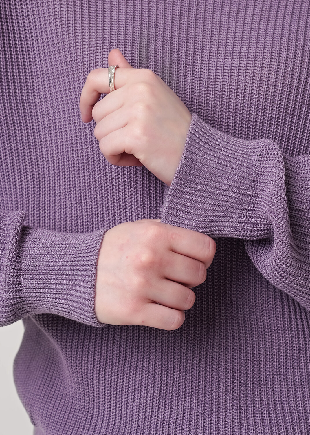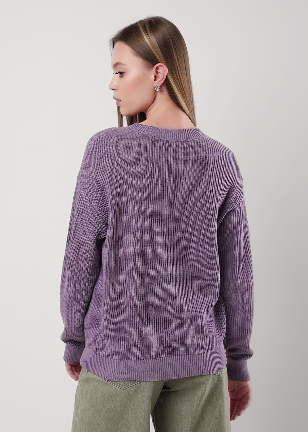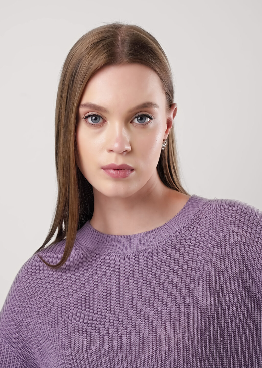 Вязаный джемпер умеренного объема из акриловой пряжи с добавлением хлопка, переплетение полуфанг. Округлая горловина с бейкой. Длинный рукав со спущенной линией плеча. По низу изделия и рукава манжет. Спереди нашивка металл.