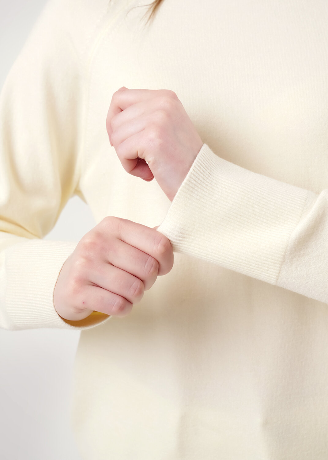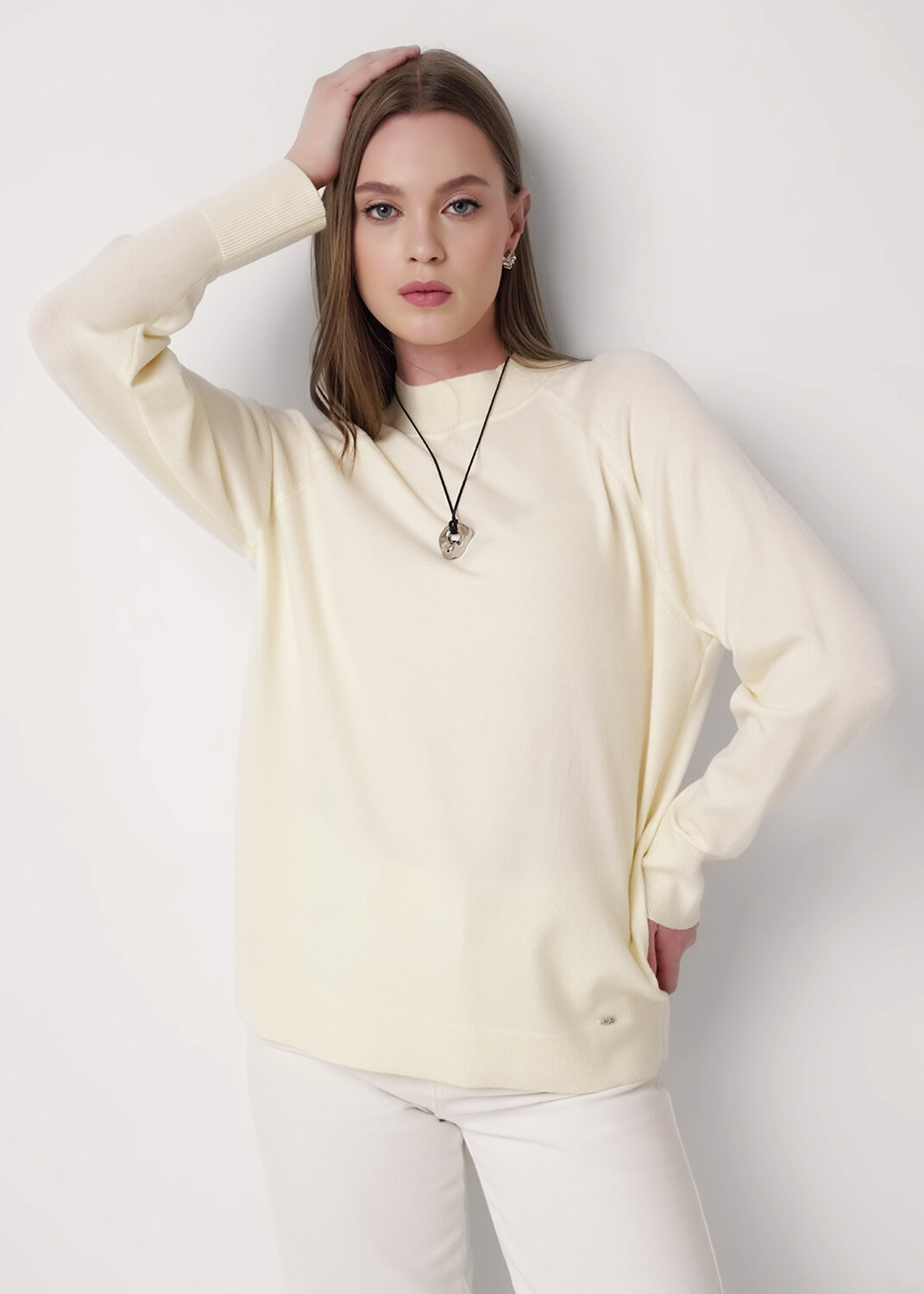 Вязаный джемпер свободного силуэта из вискозной пряжи, переплетения гладь. Длинный рукав реглан. Округлая горловина стойка без загиба. По низу изделия и рукавов манжеты. Спереди нашивка металл.