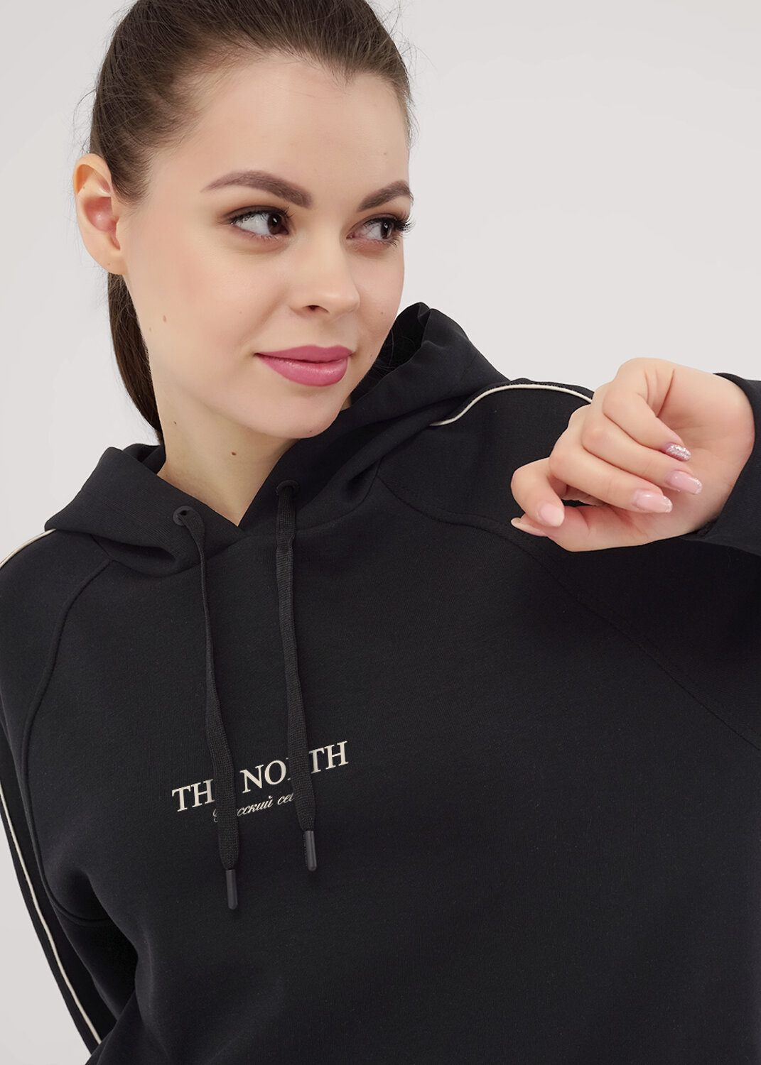 Джемпер спортивный из трикотажного полотна, свободного кроя. По горловине капюшон со шнуром. Длинный рукав реглан. По низу рукава и изделия манжет. Спереди карман кенгуру, принт вспенка. По линии плеча и рукаву контрастный кант. На полочке принт.