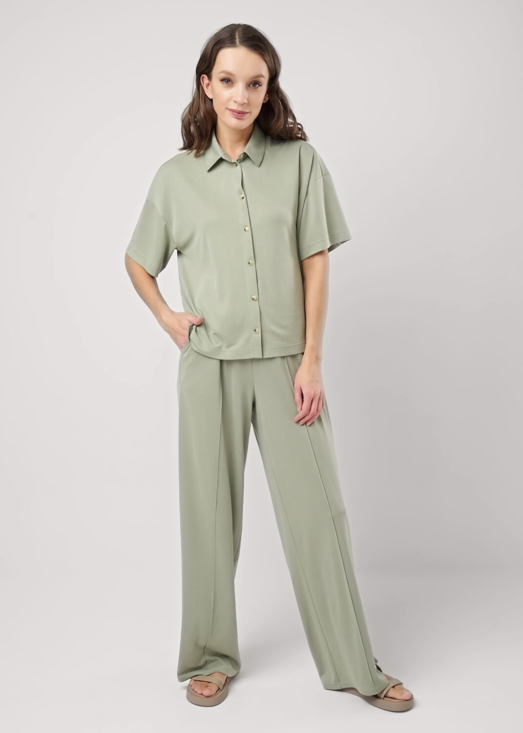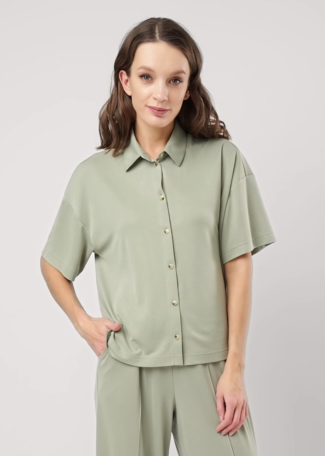 Блузка из вискозного трикотажного полотна пике, свободного кроя. Втачной короткий рукав. Отложной воротник со стойкой, спереди цельнокроеная планка на пуговицах. Боковые разрезы.
