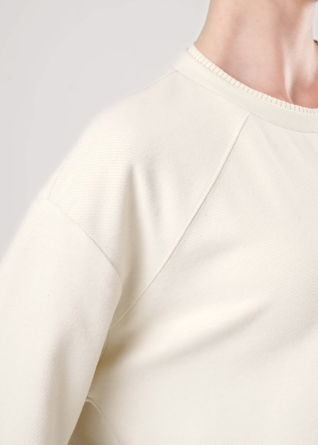 Джемпер объёмный из поливискозного трикотажного полотна джерси. Спущенный длинный рукав. Округлая горловина с двойной вязаной обтачкой. По переду декоративные защипы. Фигурный низ изделия.