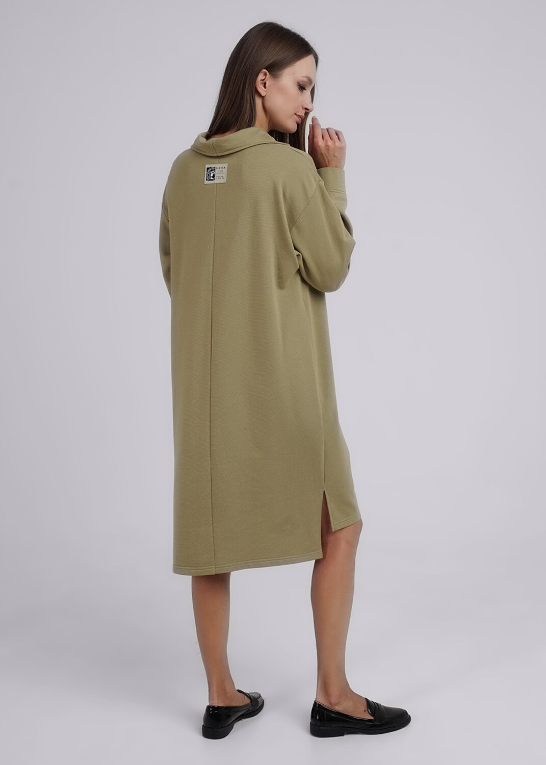 Платье прямого силуэта из трикотажного полотна - рибана с начесом, длиной до колена,боковые разрезы. Спущенная линия плеча, длинный рукав с манжетом. Фигурный вырез стойка. Сзади по спинке средний шов, нашивка.
