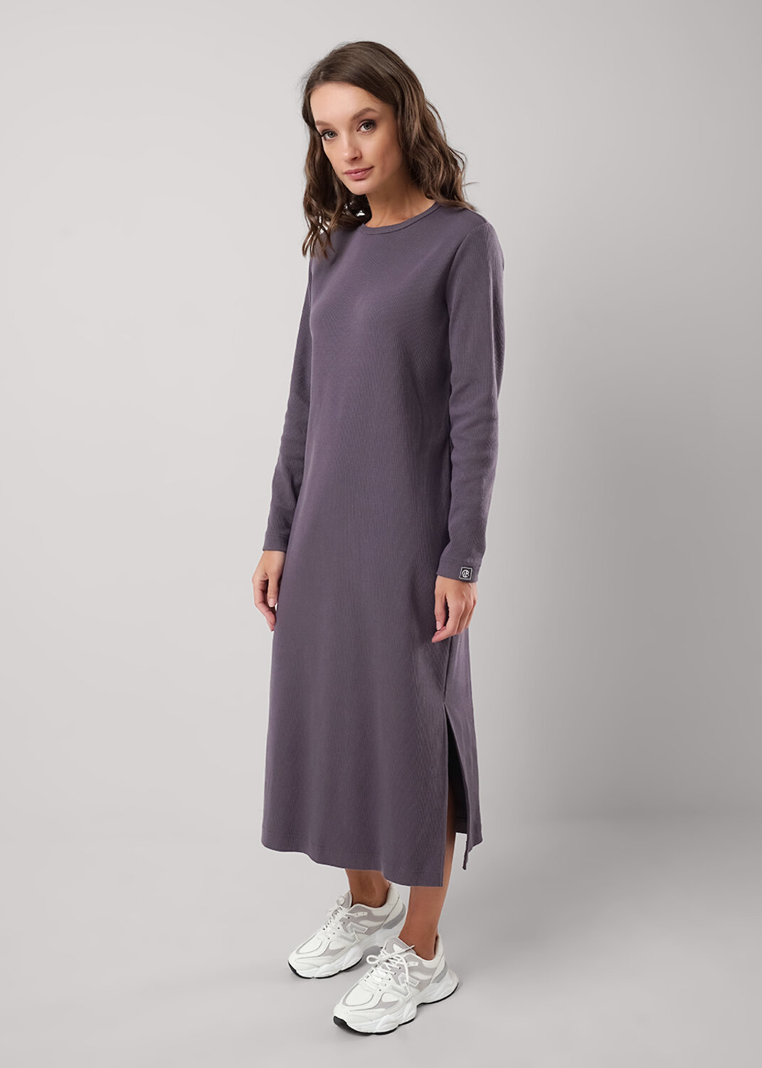 Платье из трикотажного эластичного полотна кашкорсе. Прямого силуэта длиной миди,по бокам разрезы. Округлая горловина с окантовкой. Длинный втачной рукав, внизу нашивка. На спинке принт.