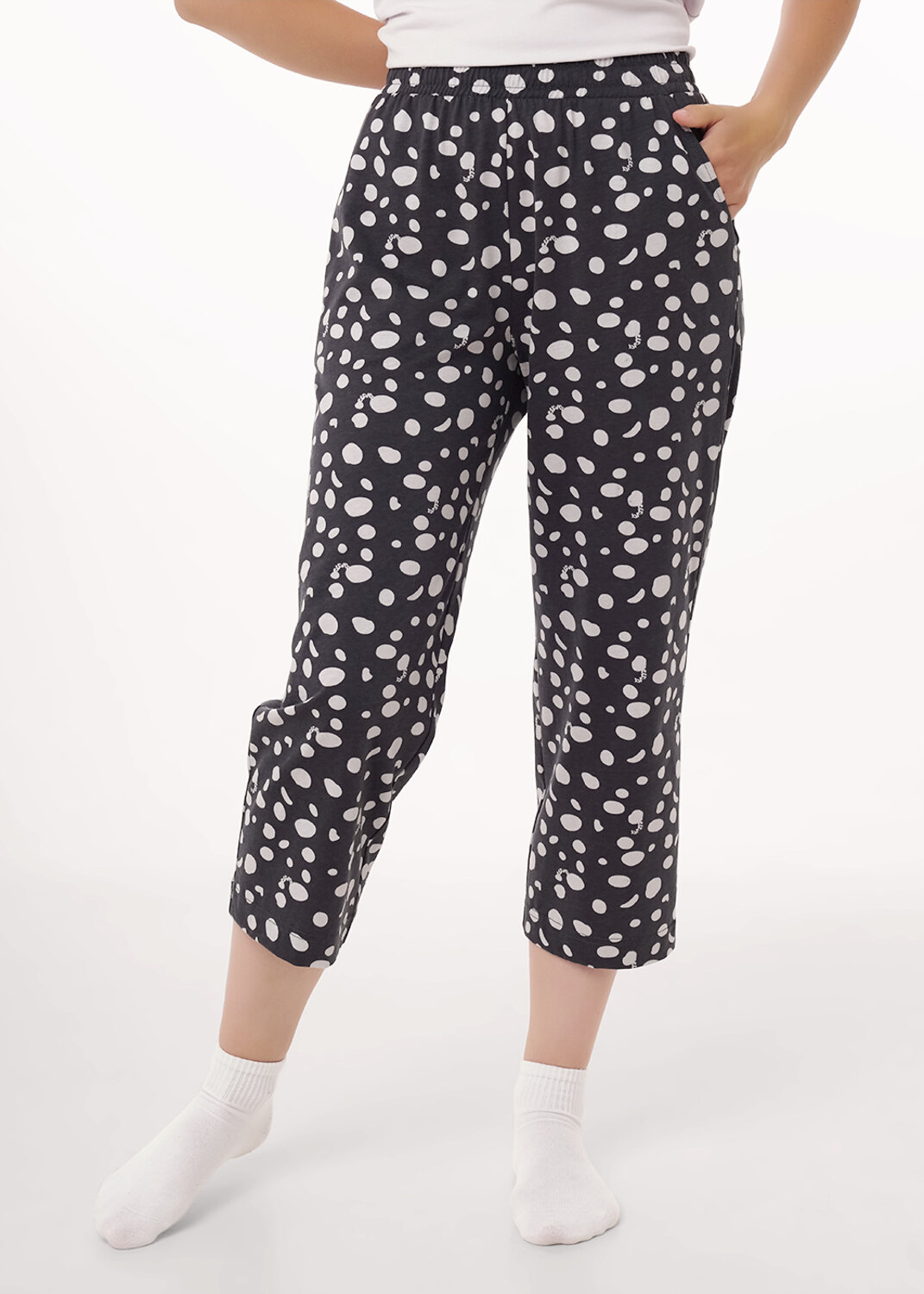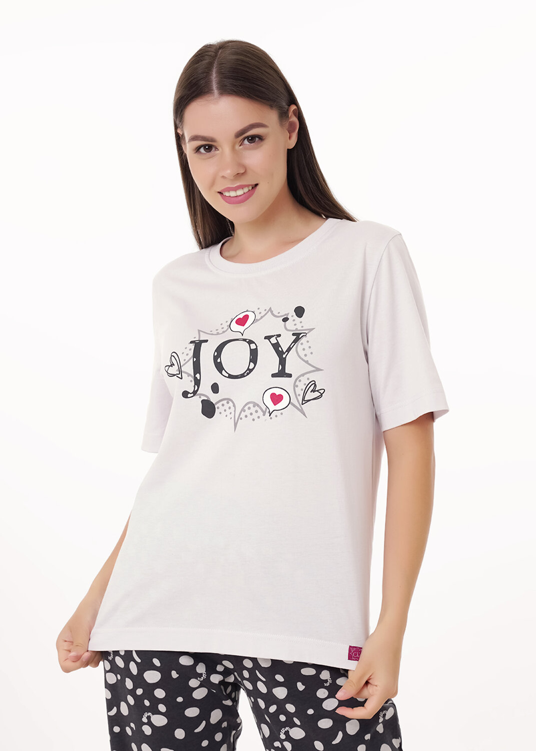 Набор одежды из хлопкового трикотажного полотна. Футболка прямого кроя, короткий втачной рукав, округлая горловина с обтачкой. Спереди принт. Внизу нашивка. Бриджи с поясом на внутренней резинке. Боковые карманы с отрезным бочком.