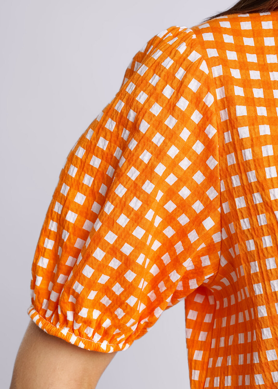 Платье объемное из трикотажного полотна длиной выше колена. Втачной, объемный рукав. Округлая горловина. Орезная юбка.