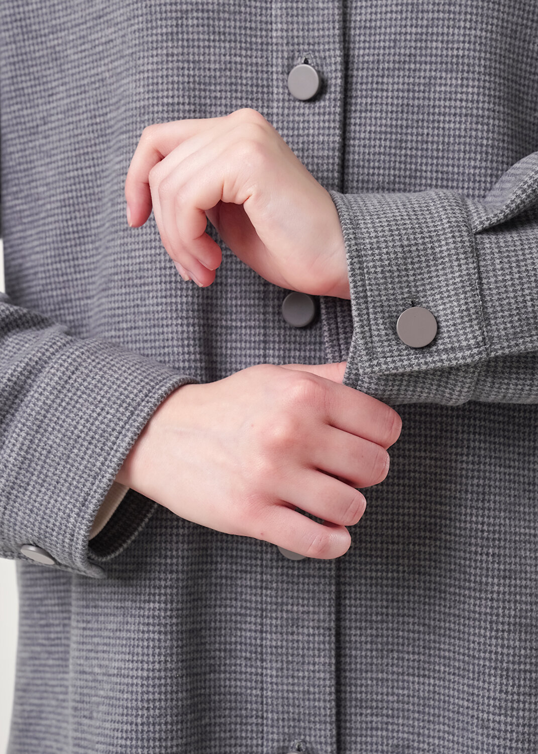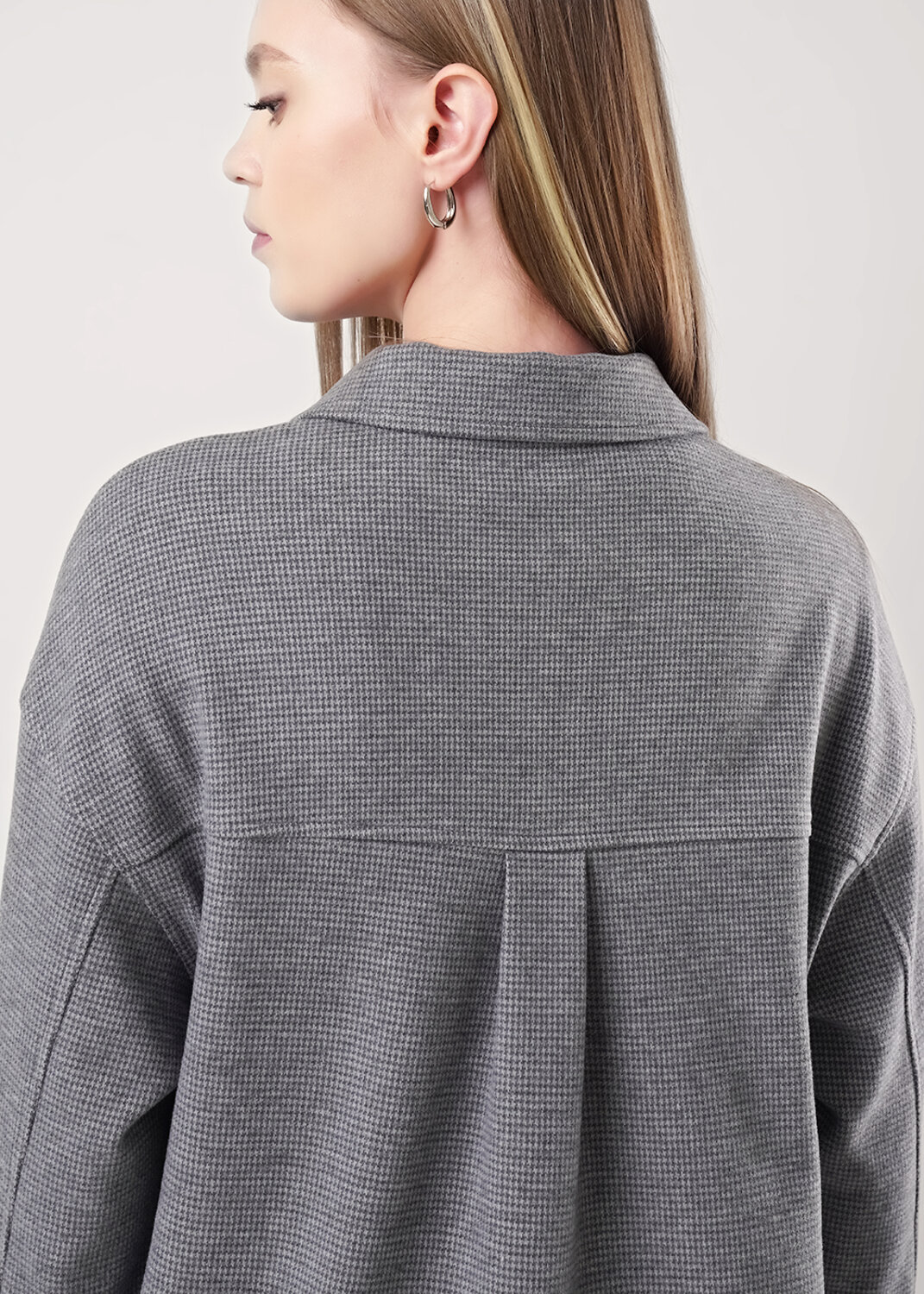 Куртка прямого силуэта из трикотажного полотна джерси. Отложной воротник на стойке. По переду планка с застежкой на пуговицы, на спинке кокетка с бантовой складкой. Длинный рукав со спущенной линией плеча, внизу манжет на пуговице. Фигурный низ изделия.