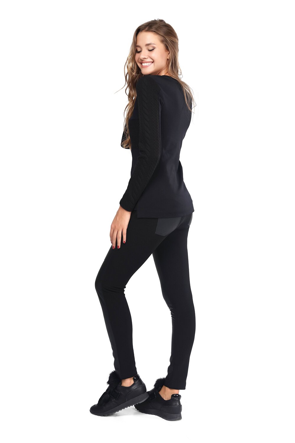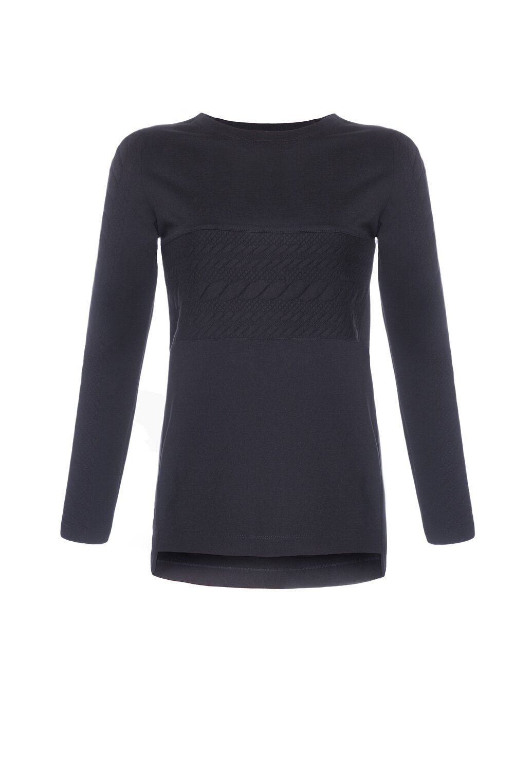 Лаконичный трикотажный джемпер полуприлегающего силуэта подходит для формирования базового повседневного гардероба. Мягкое, эластичное полотно с высоким содержанием вискозы. Изделие отлично держит заданную форму, легко в уходе, сохраняются первозданные качества даже после многочисленных стирок. Длинные рукава декорированы эффектным узором, имитирующим узорную вязку. Отличный комби-вариант для узких джинсов и кожаных леггинсов.