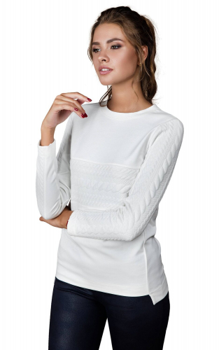 Туника женская из трикотажного полотна (комбинированная) с втачным рукавом 3/4. Горловина круглая. Рукава и окантовка по горловине выполнены из отделочного полотна эко-кожа. Спинка со швом по центру.