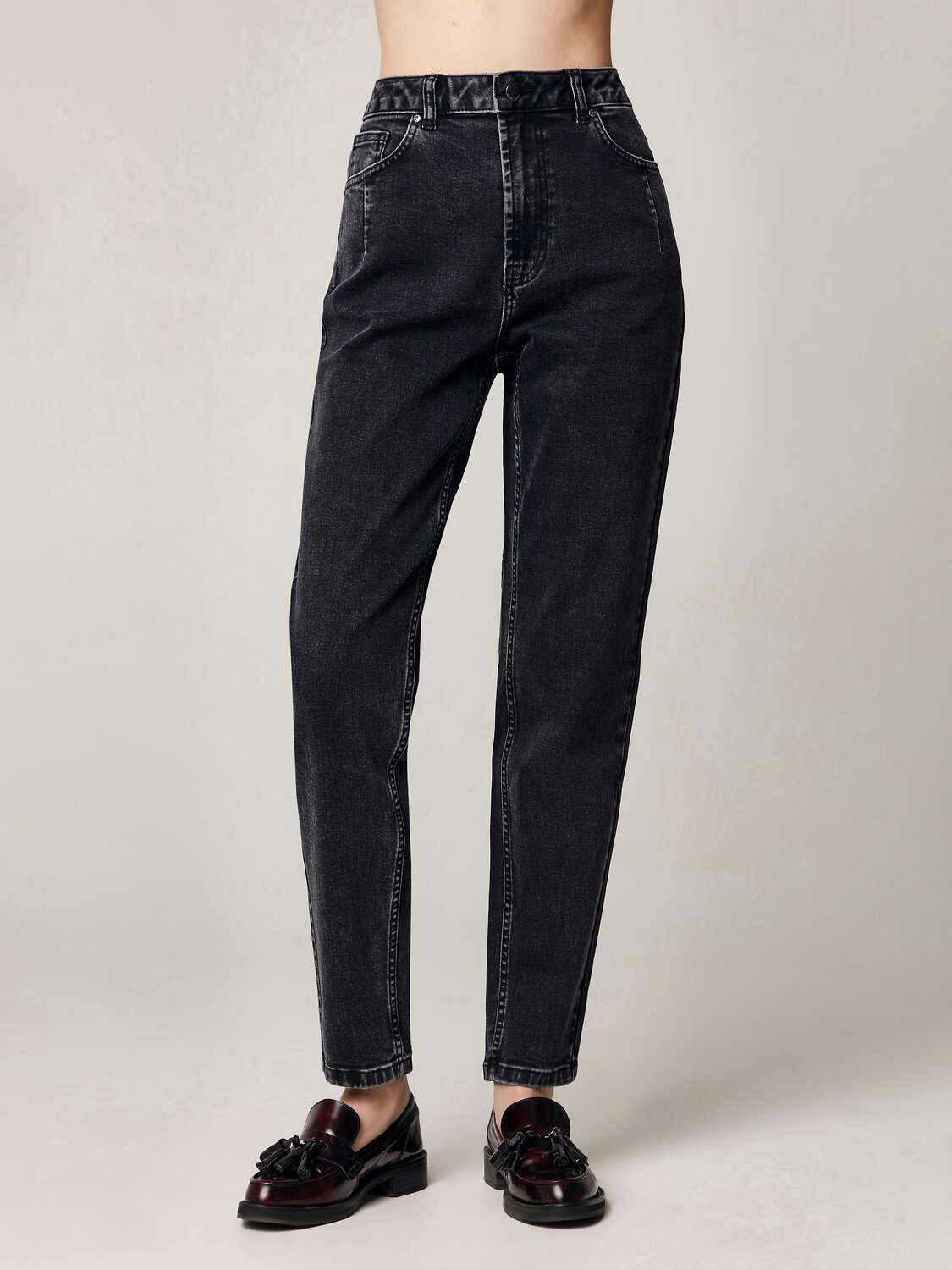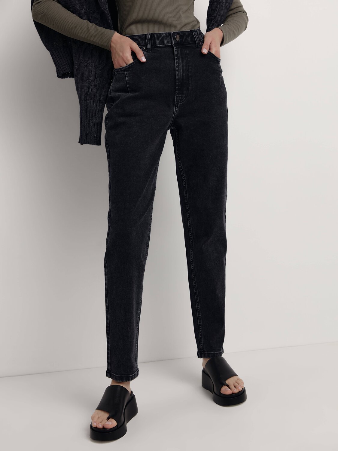 Джинсы mom с высокой посадкой подойдут девушкам с разными типами фигуры: благодаря высокой посадке, акцентным выточкам по карманам, прилегающему крою в области бедер и слегка зауженным штанинам модель визуально моделирует силуэт.