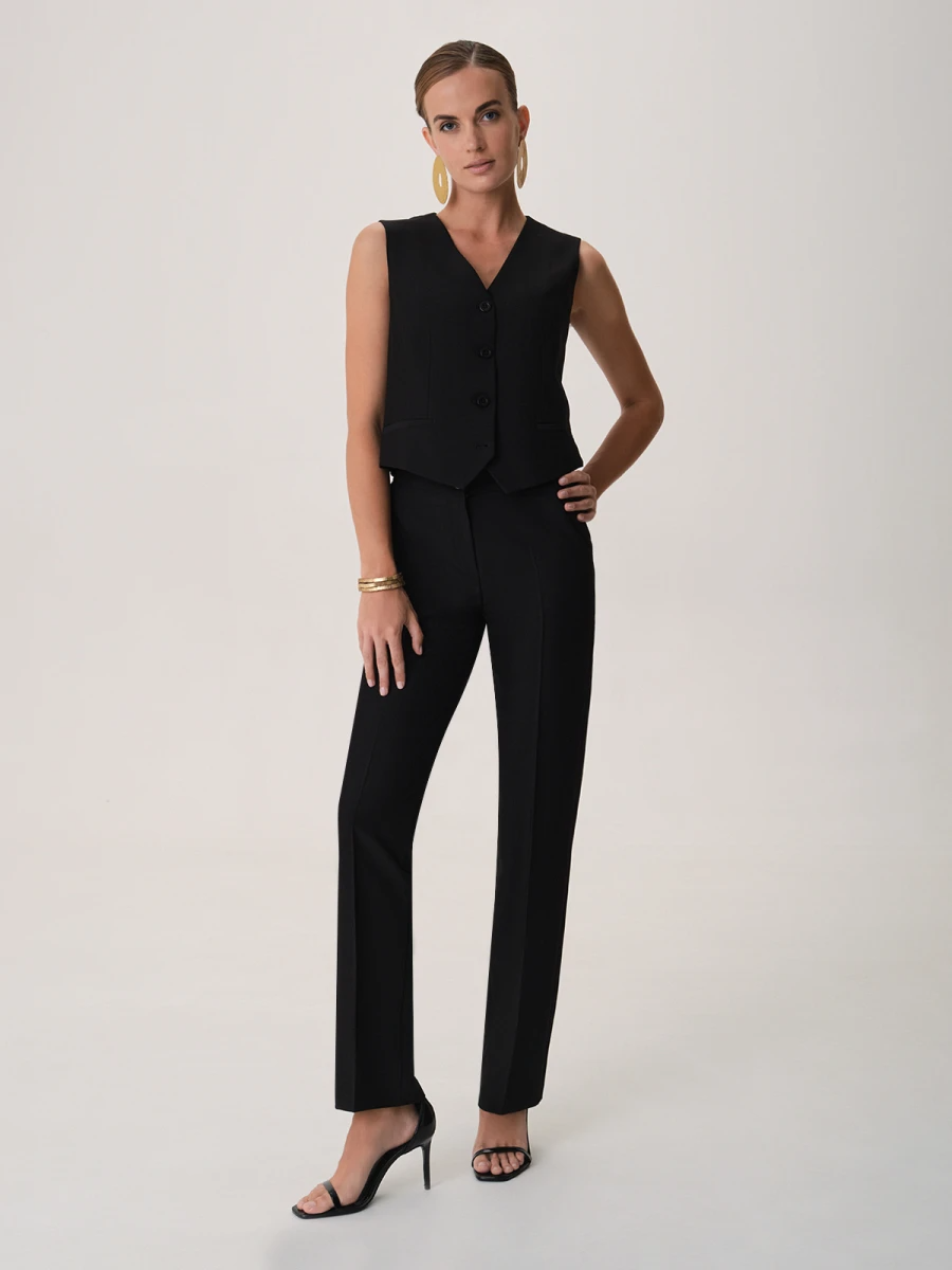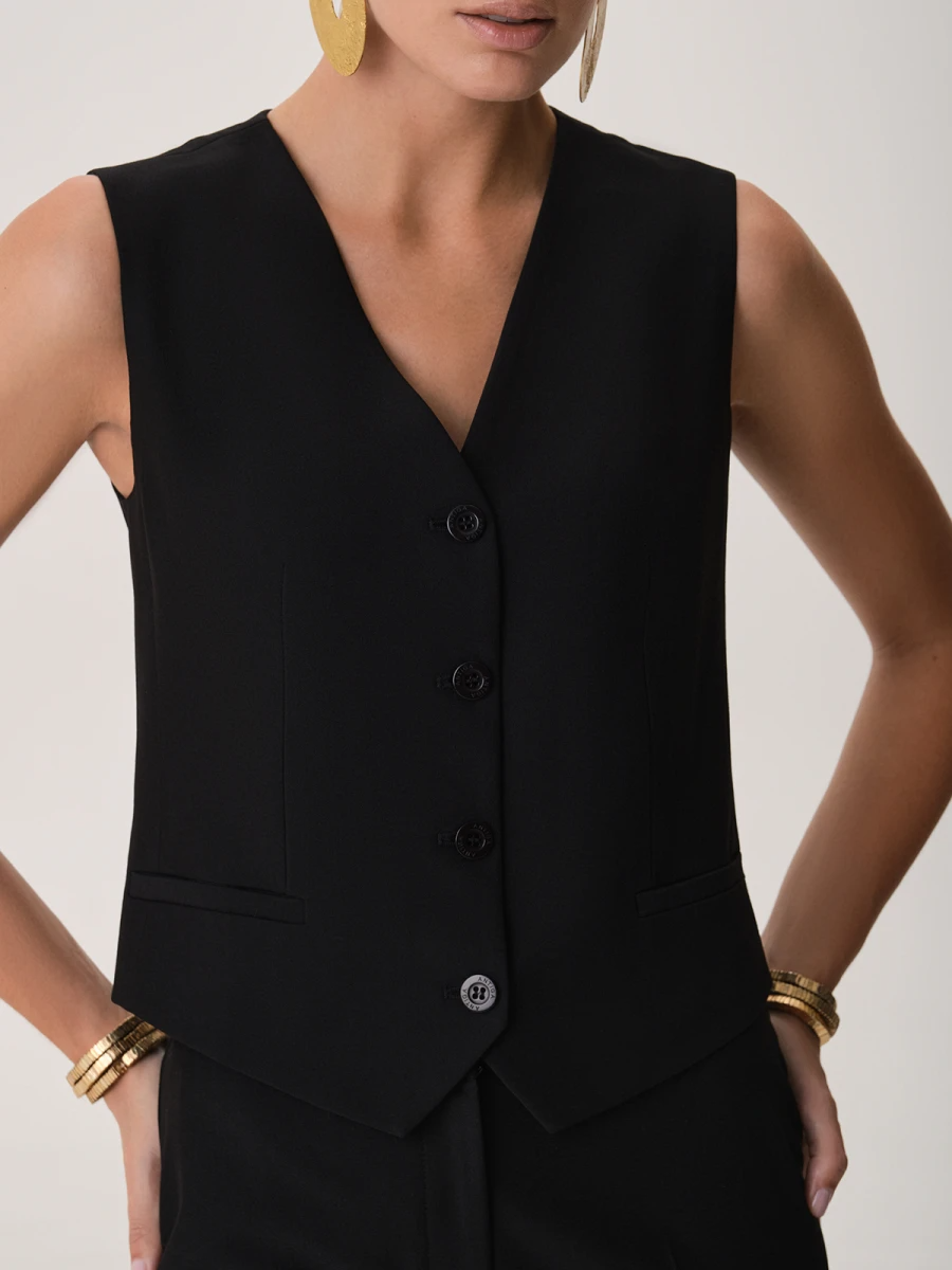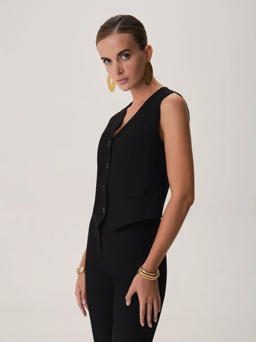 Чёрный жилет полуприлегающего силуэта — универсальная база для современного гардероба. Аккуратный V-образный вырез подчёркивает линию шеи и придаёт образу элегантность, а приталенный крой мягко формирует женственный силуэт. Модель застёгивается на ряд классических пуговиц, создавая чистую и лаконичную вертикаль, визуально вытягивающую фигуру. Узкие прорезные карманы выступают как декоративный элемент и поддерживают строгость дизайна.