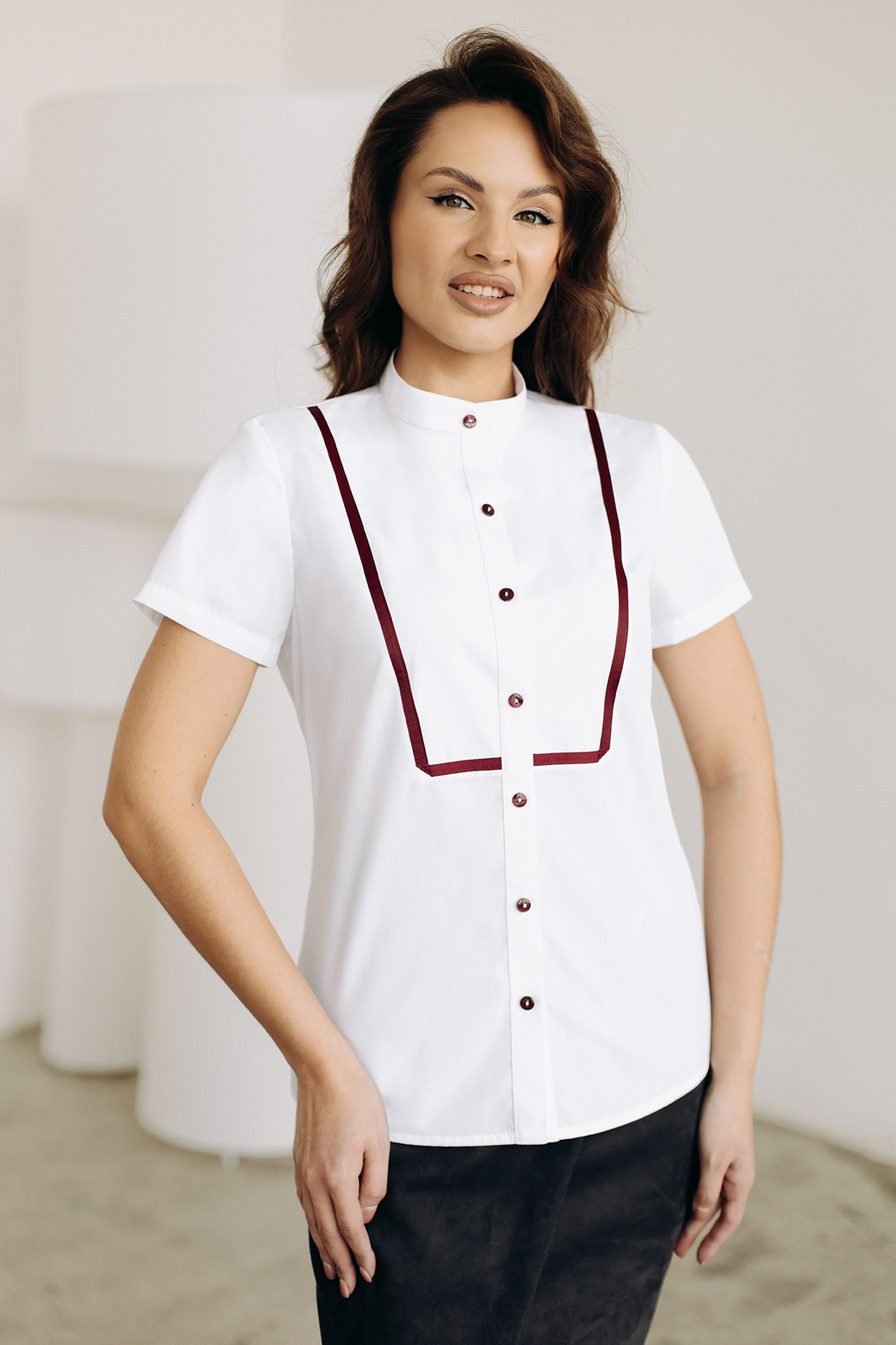 Яркая блузка с отделкой по краю необычной кокетки. Сорочечная ткань, 55% хлопок, 45% ПЭ. Цвет белый+бордовая лента и пуговицы