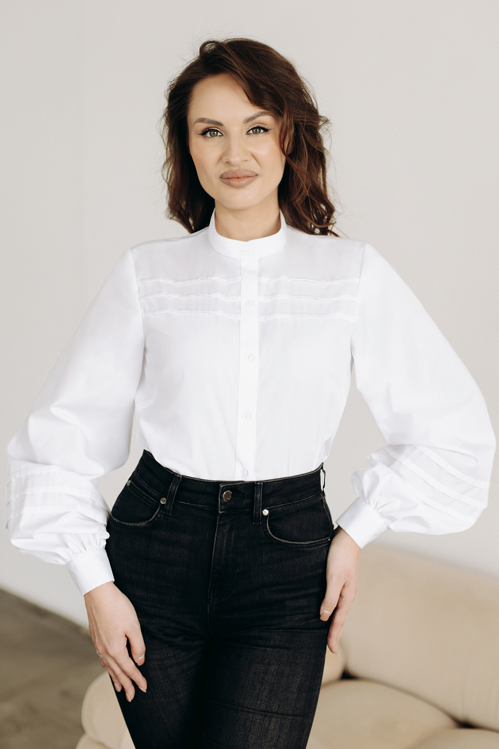 Лаконичная строгая блузка с декоративными складками по линии кокетки и необычными объёмными рукавами . Сорочечная ткань: 55% хлопок, 45% ПЭ. Цвет белый