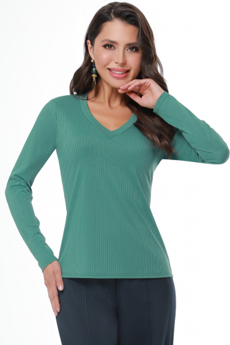 Эта блузка выполнена из трикотажа светло-голубого цвета с длинными рукавами. Особенностью изделия является сборка по длине бокового шва, придающая ему оригинальный вид. Разрез в нижней части шва добавляет блузке уникальности и изысканности.
